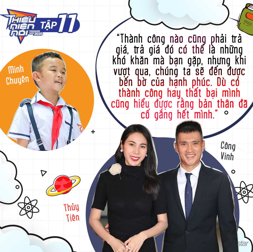 Xuất hiện bất ngờ trong tập 11 Thiếu niên nói 2020, cặp đôi vợ chồng sao Việt Công Vinh - Thủy Tiên có những chia sẻ hết sức sâu lắng và ấn tượng. Từ câu chuyện đam mê của Minh Chuyên, dưới góc nhìn của một đứa trẻ lớn lên ở vùng nông thôn trải qua rất nhiều gian khó để có thể đi đến thành công, trở thành ngôi sao bóng đá huyền thoại của Việt Nam, Công Vinh đưa đến bài học đầy giá trị về sự kiên trì và nỗ lực.