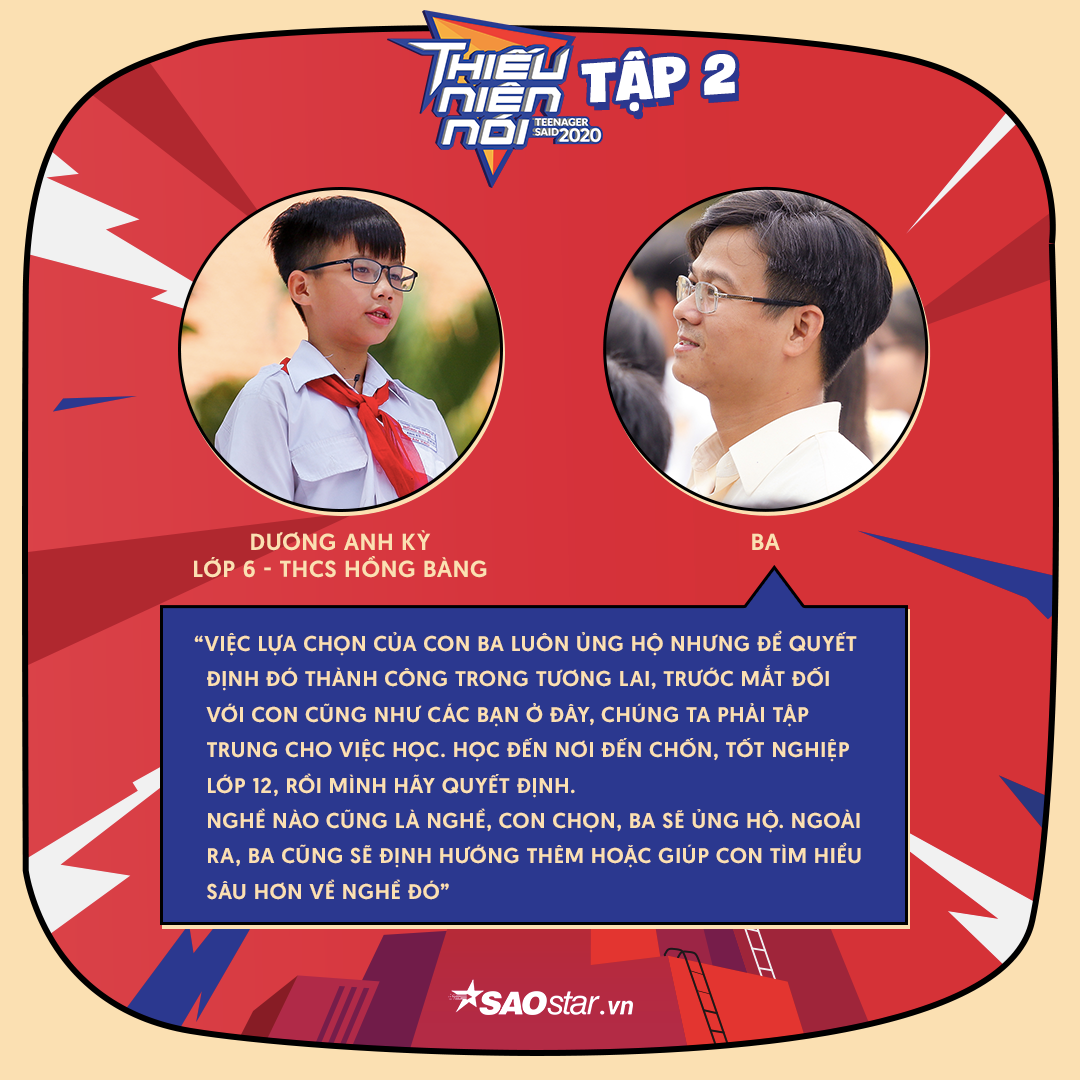 Tương tự mẹ của Gia Bửu, bố của Dương Anh Kỳ cũng ủng hộ cậu bé theo đuổi nghề diễn viên nhưng để quyết định đó thành công trong tương lai, trước mắt đối với cậu cũng như các bạn học sinh cung trang lứa phải tập trung cho việc học.