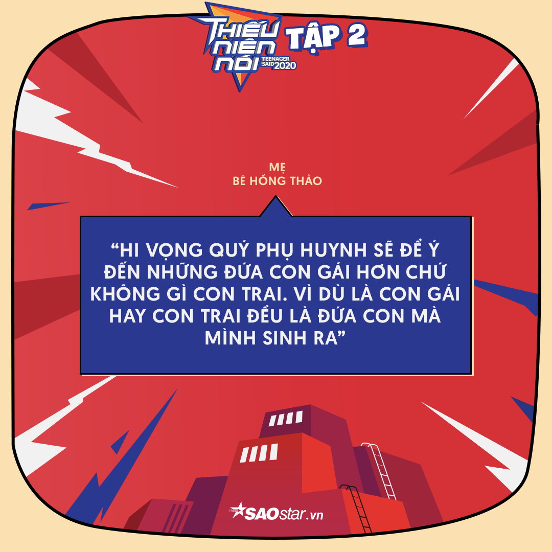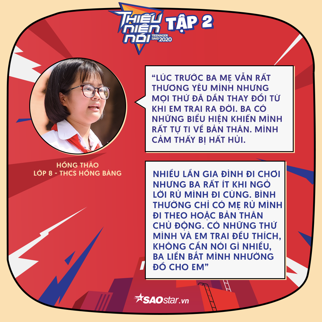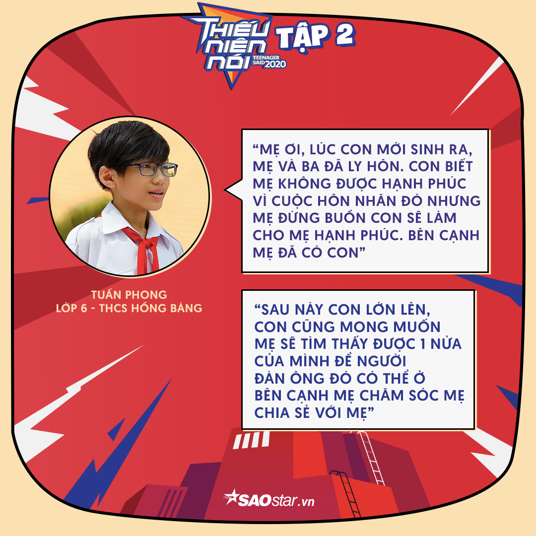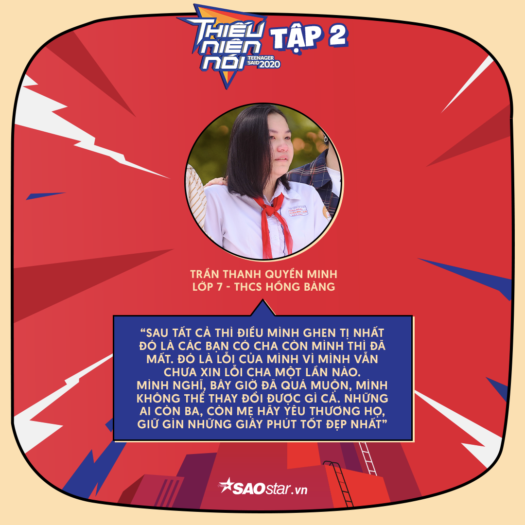 Hoàn cảnh sống đặc biệt sớm đưa đến cho các em nhỏ những suy nghĩ trưởng thành là điều khán giả có thể cảm nhận được từ các câu chuyện cảm động ở Tập 2 Thiếu niên nói 2020. Đó là những “mất mát” chẳng ai muốn xảy ra với 1 đứa trẻ còn đang tuổi đi học nhưng việc các em biết chấp nhận lỗi lầm, suy nghĩ tích cực đã giúp khán giả có cái nhìn ngưỡng mộ.