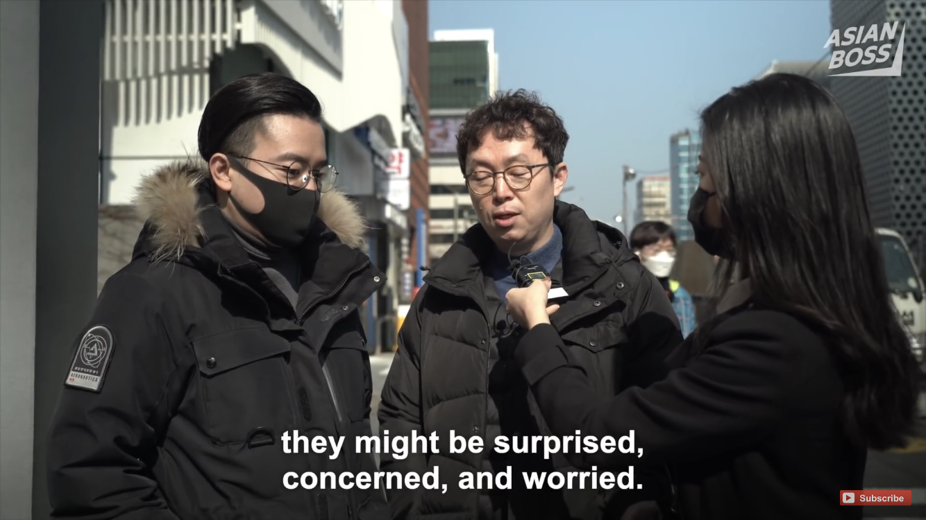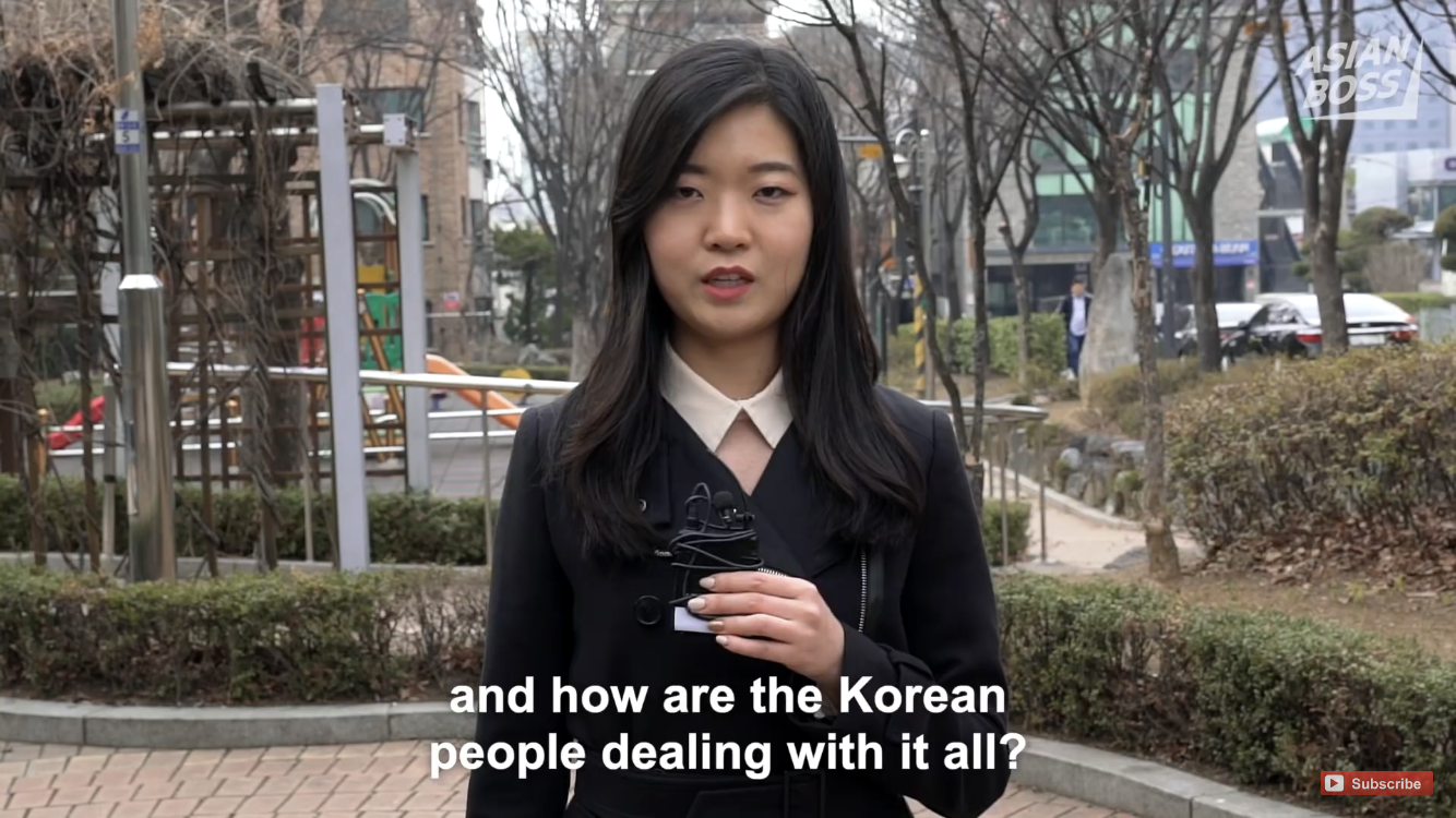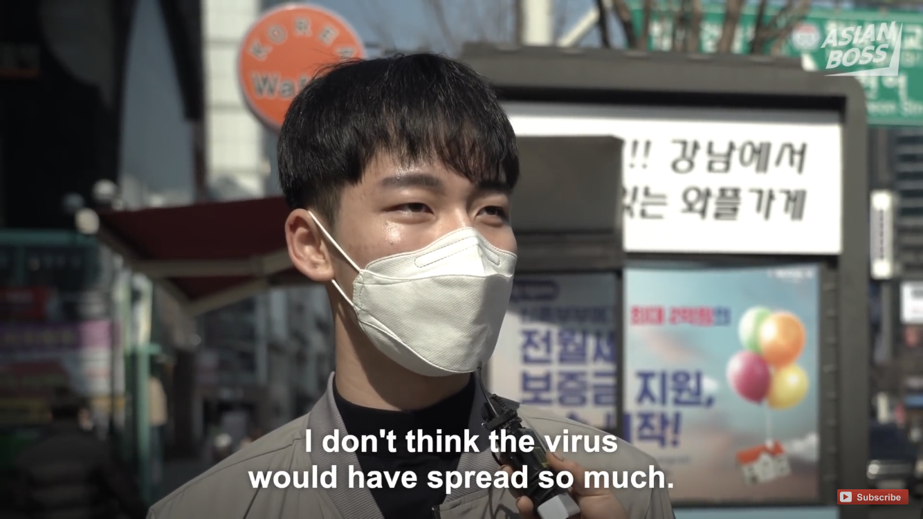 Trước đó, Hàn Quốc đã bị ảnh hưởng phần lớn bởi COVID-19, đây cũng là một trong những quốc gia bị ảnh hưởng nhiều nhất trên thế giới. Một kênh YouTube có tên là Asian Boss đã tiến hành phỏng vấn một số người Hàn Quốc trước ảnh hưởng của dịch bệnh này đến cuộc sống của họ. Nhiều công dân nước này tiết lộ đã có rất nhiều hành động thận trọng để đối phó với tình huống này, chẳng hạn như các công ty cho phép nhân viên làm việc tại nhà.