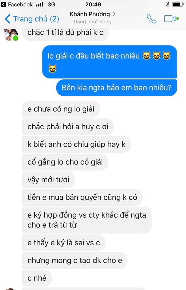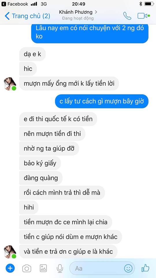 Mới đây, Á hậu biển Khánh Phương bất ngờ bị một người bạn đăng đàn tố về việc vay tiền để dự thi quốc tế nhưng mãi không thấy trả. Cụ thể, người này đã công khai những tin nhắn giữa cả hai đồng thời chia sẻ: “Chị ơi giúp em đi, em hứa sẽ trả chị mà, chị tin em lần này nữa đi. Đây là Lời nói của Cô Á Hậu Biển Khánh Phương khi cô ấy cần tiền đi thi quốc tế và lấy cái giải vote của Miss Supranational năm 2017. Mọi người xem qua lúc nhờ vả cô ấy ngọt như thế nào? Muốn làm người nổi tiếng mà chữ Tín ko giữ? Câu chuyện còn tiếp và mới bắt đầu“.