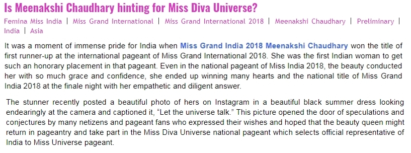 Các trang fanpage cập nhật thông tin về đại diện nhan sắc Ấn Độ tại những cuộc thi quốc tế đưa tin cuộc thi tìm kiếm Hoa hậu Hoàn vũ Ấn Độ - Miss Diva không tổ chức trong năm 2019 và sẽ trở lại vào năm 2020. Người đẹp được cho là đang “trong tầm ngắm” dự kiến sẽ đại diện Ấn Độ tham gia Miss Universe 2019 là Meenakshi Chaudhary, Á hậu Hòa bình Quốc tế 2018.