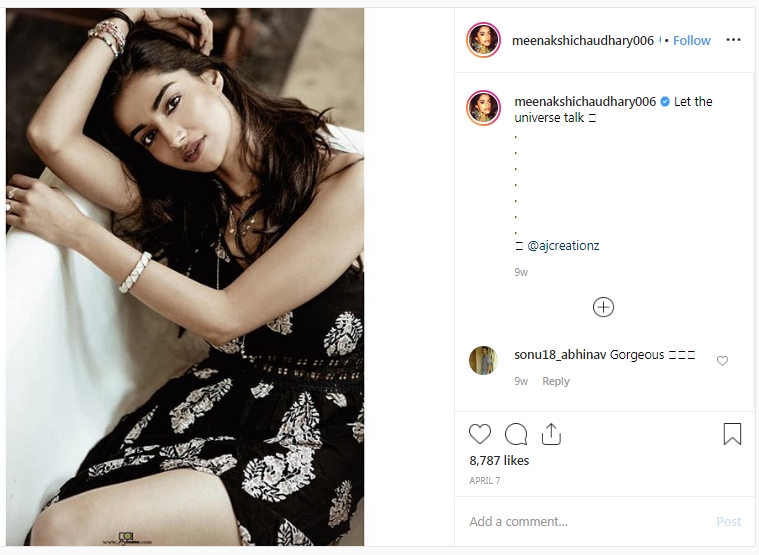 Không chỉ thế, chính Meenakshi Chaudhary cũng từng “thả thính” fan trên trang Instagram cá nhân khi chia sẻ bức ảnh cùng dòng chú thích “Let the Universe talk” - “Hãy để Hoàn vũ lên tiếng“. Điều này khiến các chuyên trang sắc đẹp quốc tế đã sớm đánh tiếng Meenakshi Chaudhary có thừa tiềm năng tỏa sáng nếu được trao cơ hội tham gia Miss Universe.