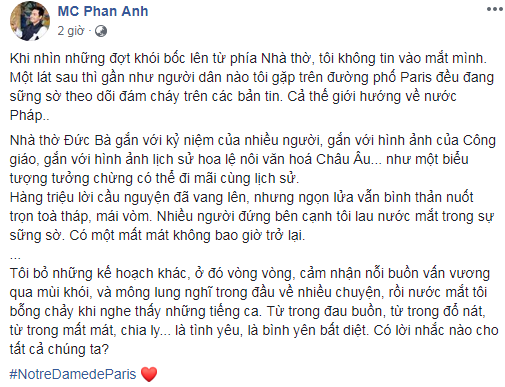 Mấy ngày qua, vụ cháy Nhà Thờ Đức Bà tại thủ đô hoa lệ Paris đã thu hút rất nhiều sự quan tâm và chia sẻ của giới sao Việt. Nhiều nghệ sĩ tỏ bày niềm xúc cảm tiếc nuối cho biểu tượng mang tính văn hóa và lịch sử lâu đời này.
