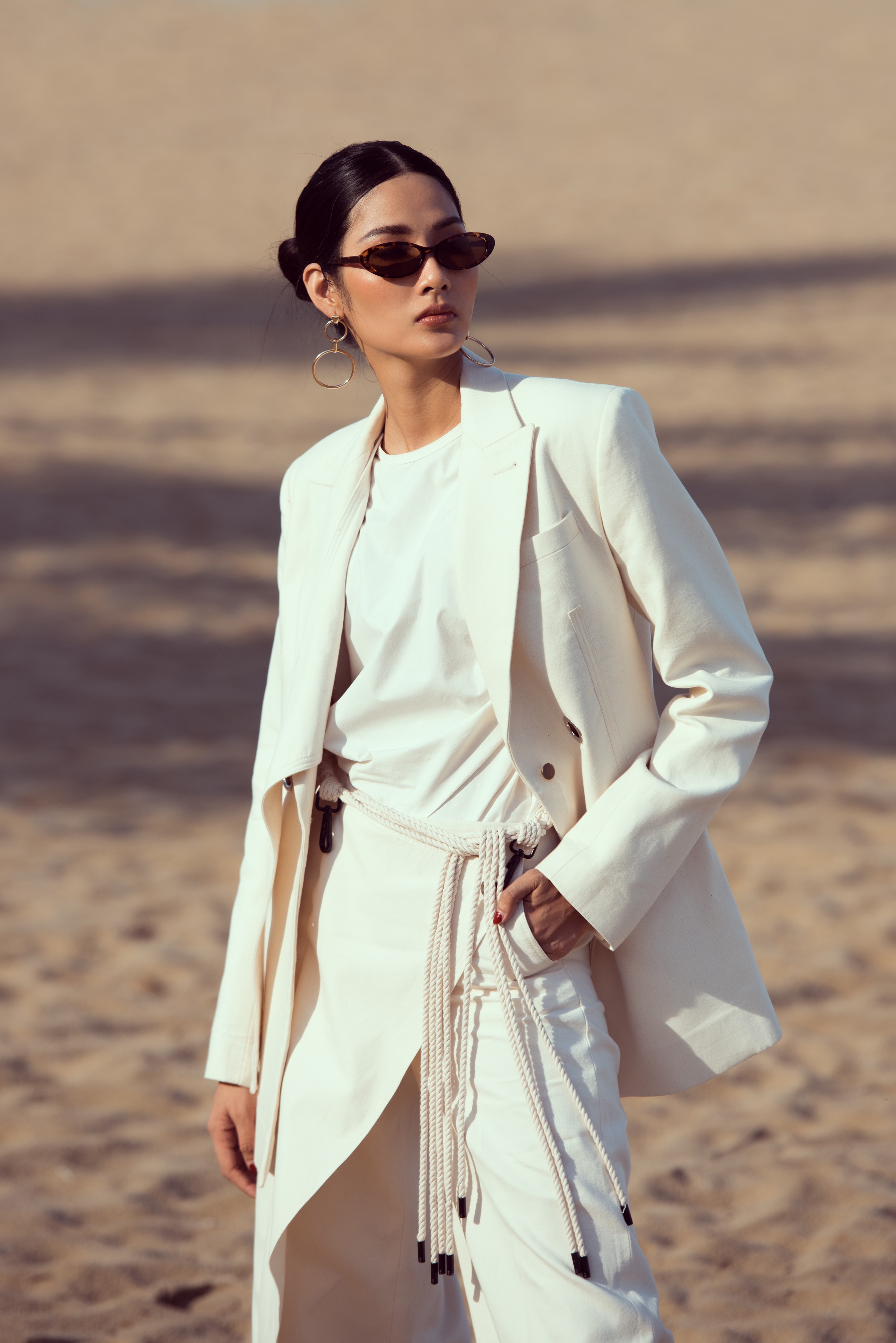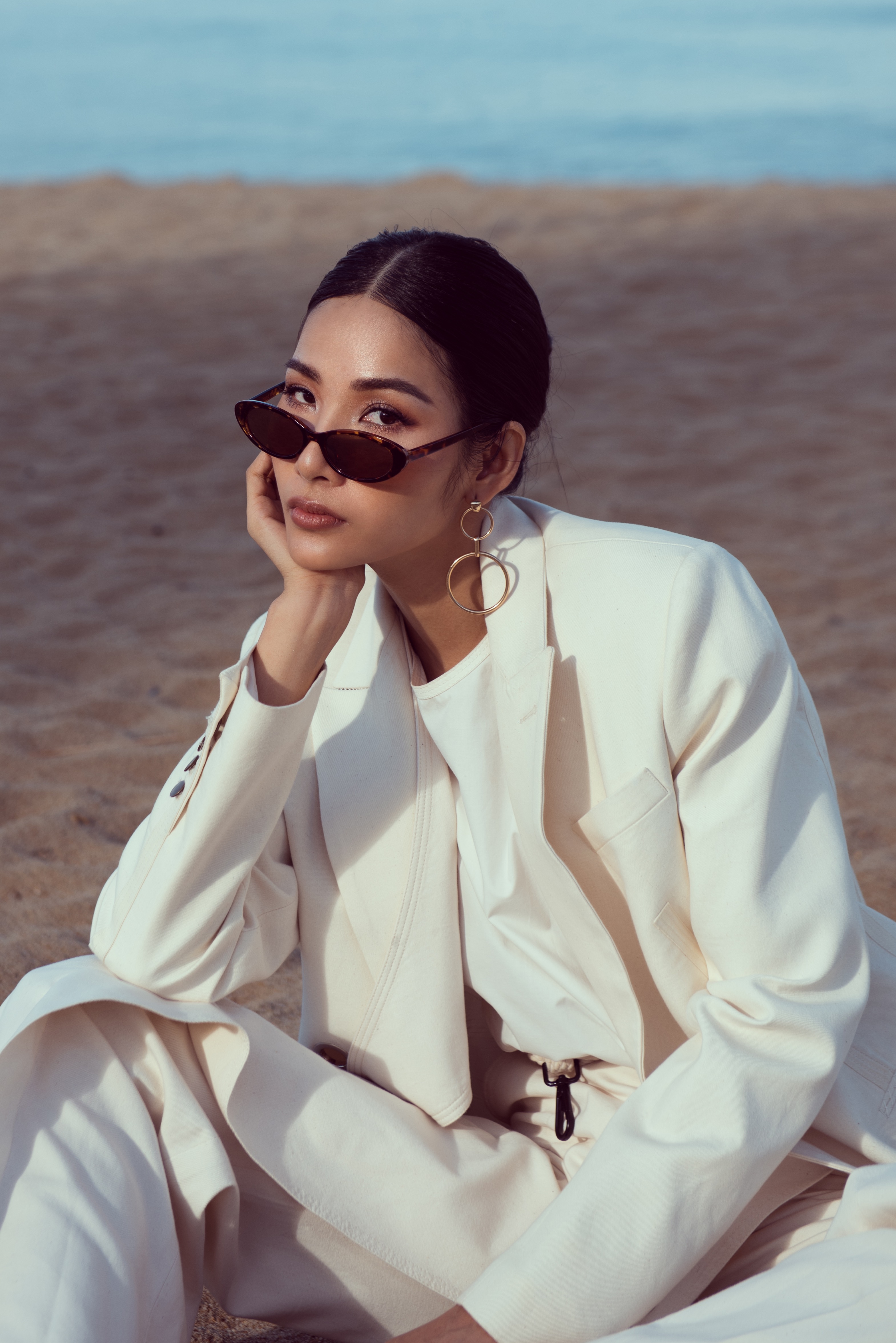Trong bộ ảnh thứ hai thực hiện ở bãi biển, á hậu Hoàng Thùy chọn sắc trắng với trang phục của Lâm Gia Khang, kết hợp cùng mắt kính đen, tôn vinh gương mặt góc cạnh và làn da nâu khỏe mạnh.Thời gian qua, á hậu Hoàng Thùy tập luyện chuẩn bị cho Miss Universe 2019, đồng thời, cô còn có một dự án cộng đồng riêng mang tên WE hướng đến đối tượng phụ nữ và giới trẻ. Cô cùng dự án WE đã thực hiện nhiều buổi nói chuyện, workshop với các bạn trẻ, nhằm nâng cao các kỹ năng mềm và tự tin hơn trong cuộc sống.