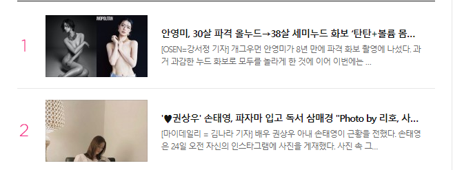 Vào sáng ngày 24/05, bộ ảnh tạp chí mới của nữ diễn viên hài Ahn Young Mi đã trở thành tâm điểm gây sốt trên cổng thông tin Naver. Được biết, tạp chí thời trang Cosmopolitan đã tiết lộ bức tranh bán n.ude (khoả thân) của cô ấy vào ngày 22 vừa qua. Ngay lập tức, Ahn Young Mi biến thành một chủ đề nóng bằng cách khoe cơ thể mạnh mẽ, thon gọn qua phương pháp tập thể dục điều độ. Và đây cũng là lần thứ hai cho ấy sở hữu cho mình bộ ảnh táo bạo chưa từng thấy kể từ khi ra mắt vào năm 2004 đến nay.