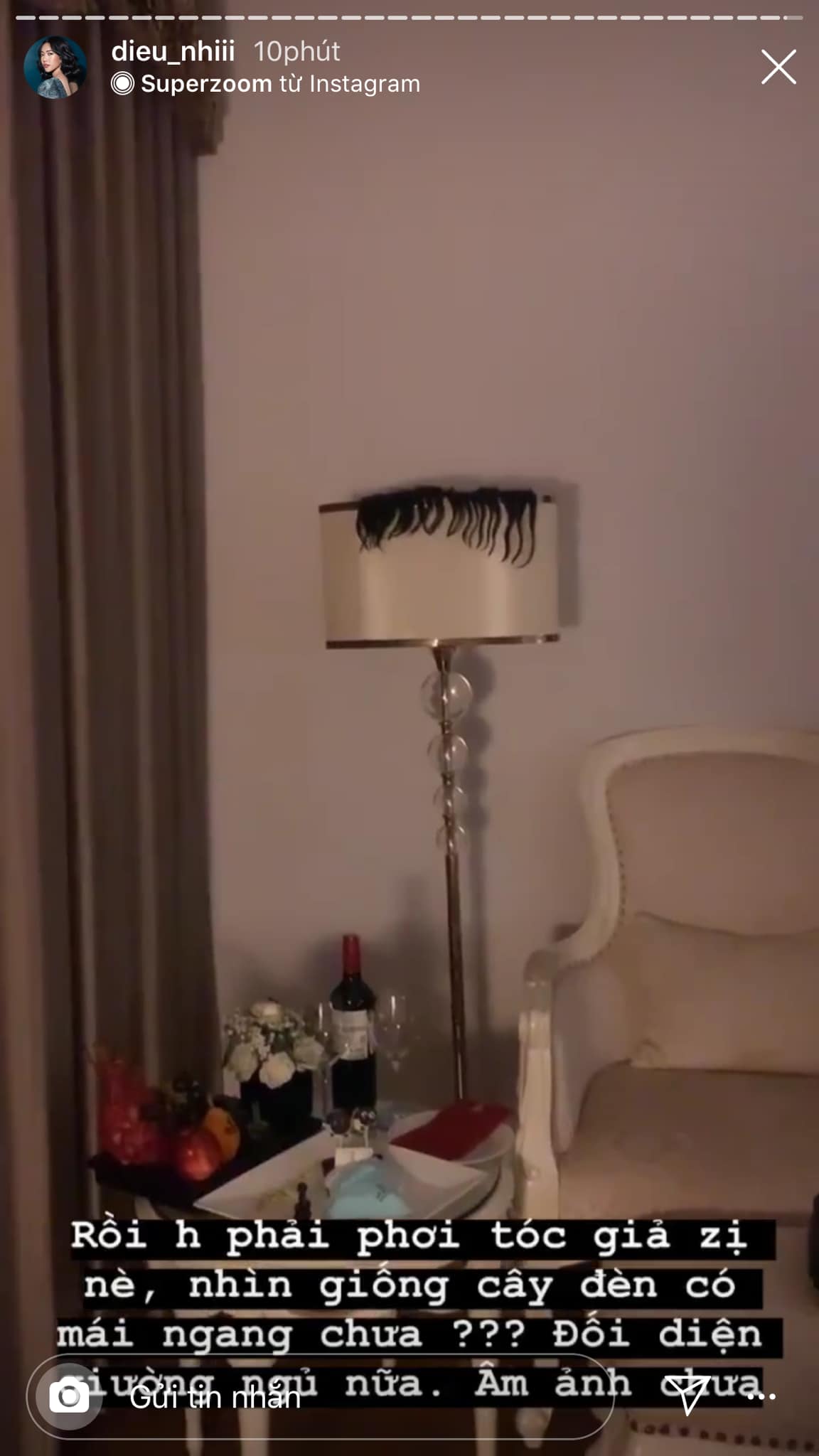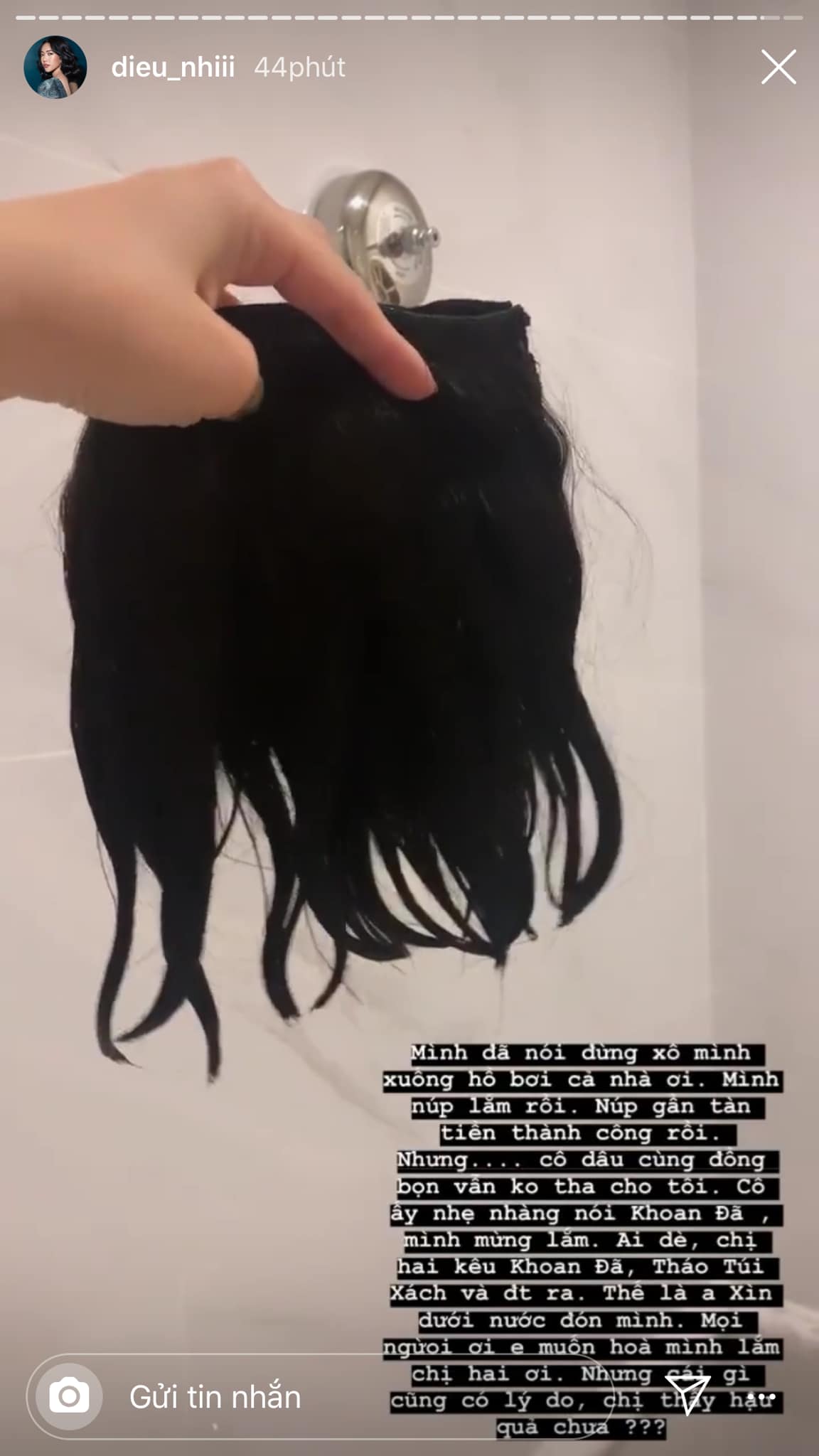 Còn với Diệu Nhi, sau vài lần phi thân xuống hồ bơi từ tự nguyện cho đến bị ném, mái tóc giả của cô nàng đã không còn ở trên đầu. Sau khi tìm thấy phần tóc mai, Diệu Nhi đành ngậm ngùi phơi khô để sáng sớm còn đội và ra sân bay. Việc Diệu Nhi đội tóc giả từng là chủ đề khiến người hâm mộ bàn luận, nữ diễn viên cũng cho biết cô sử dụng tóc giả để gìn giữ tóc thật chứ không phải do bị hói đầu.