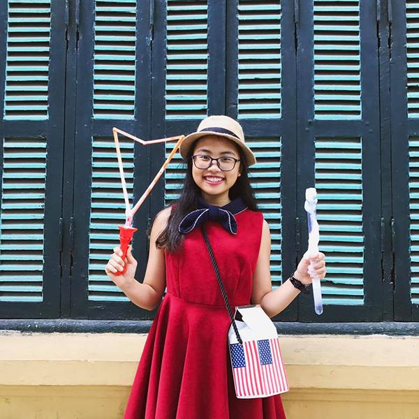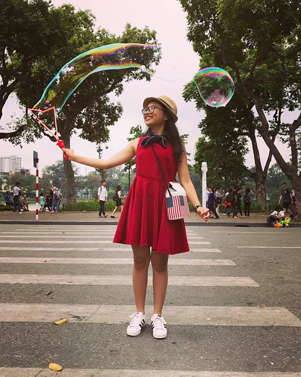 Phương Mỹ Chi chơi bong bóng ở phố đi bộ Hà Nội.