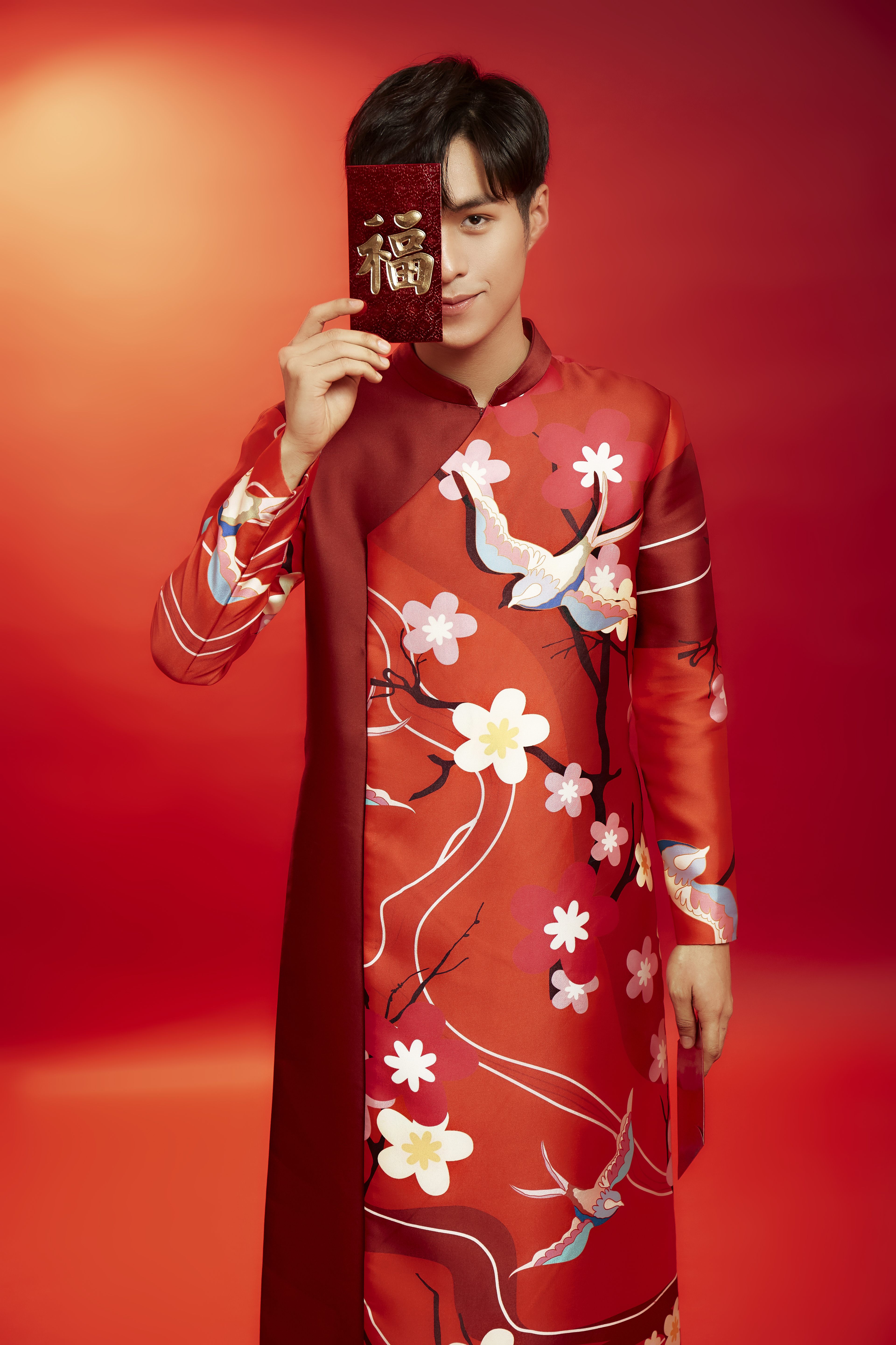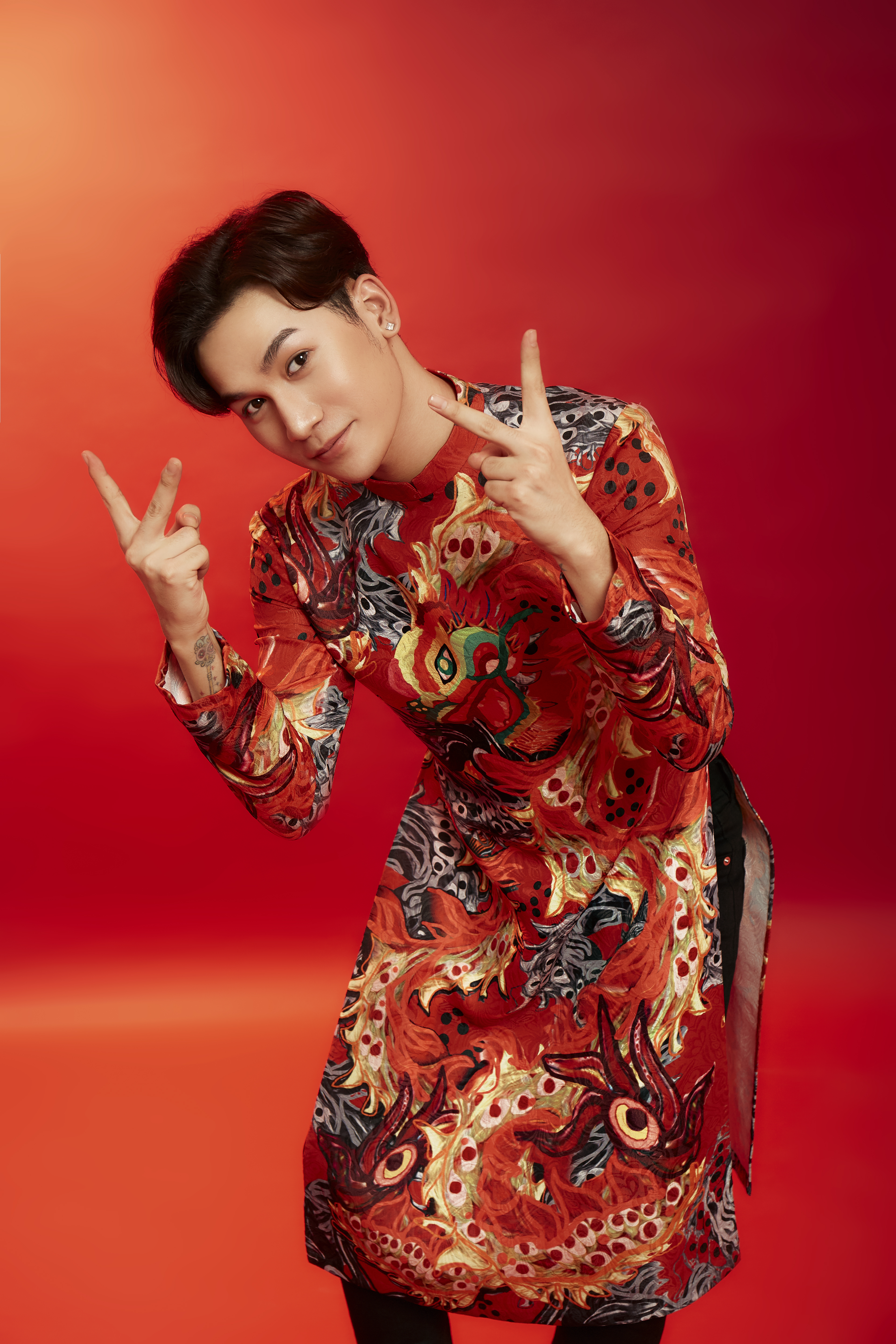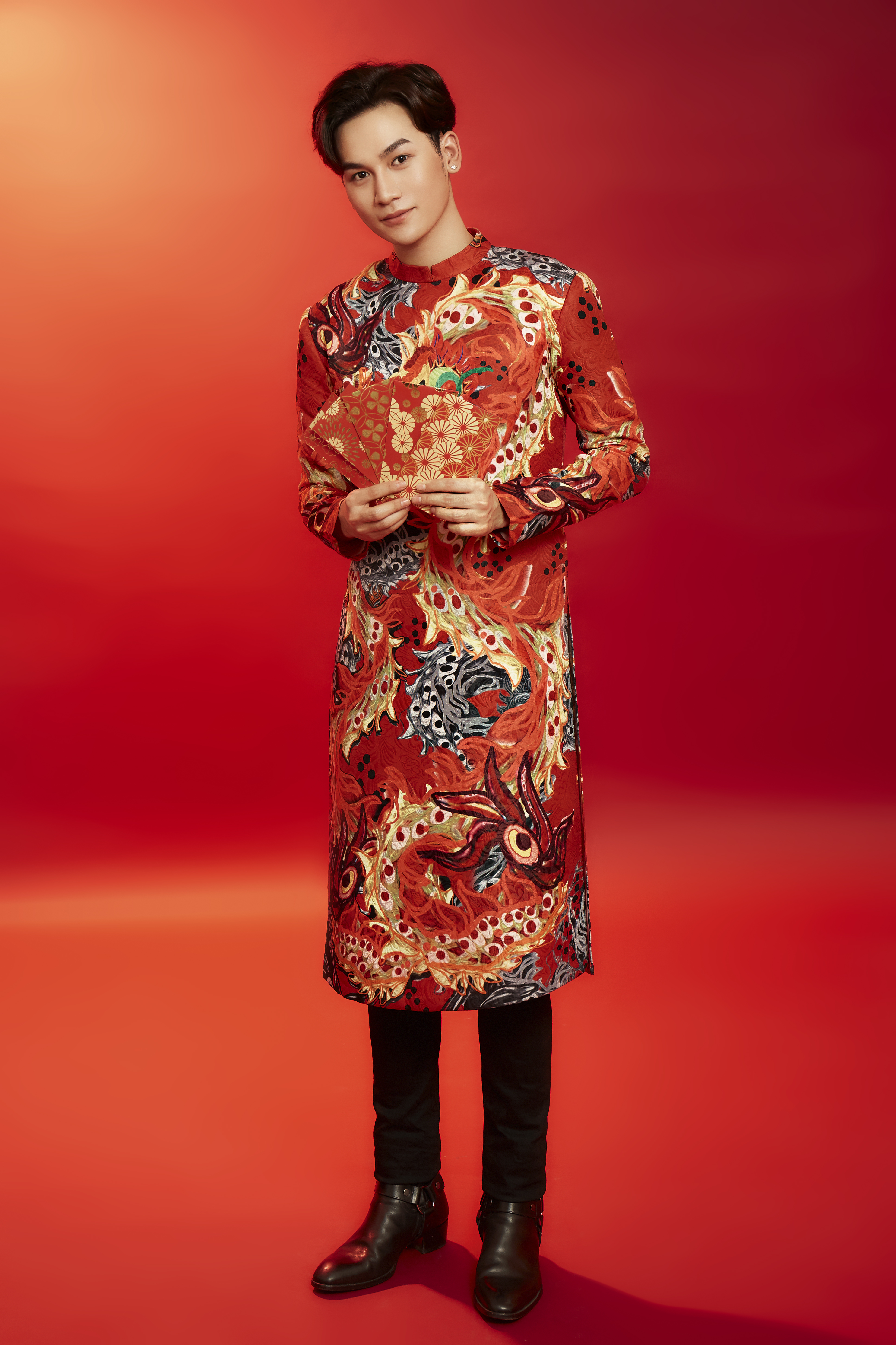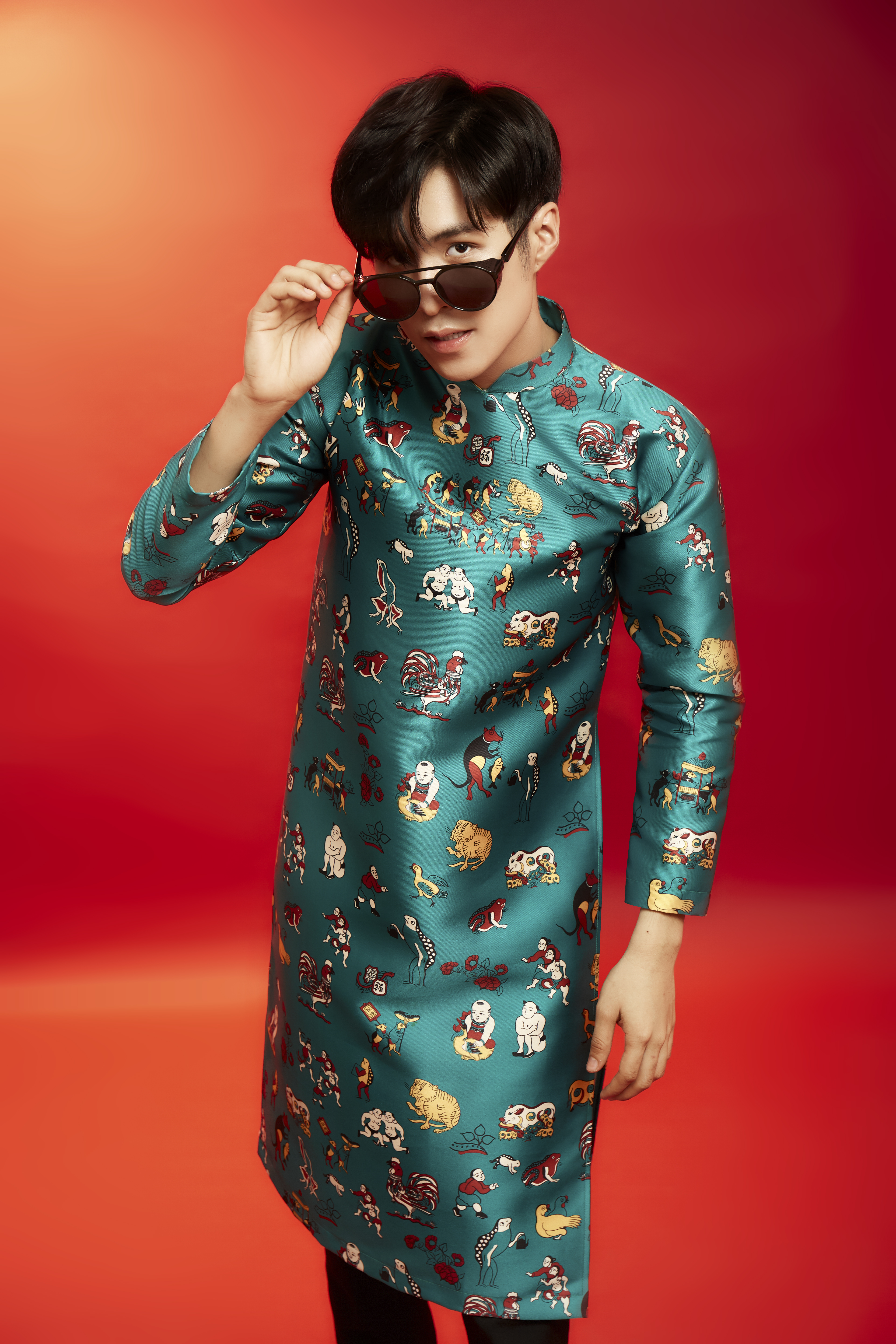 Ali Hoàng Dương điển trai với chiếc áo dài có họa tiết độc đáo.