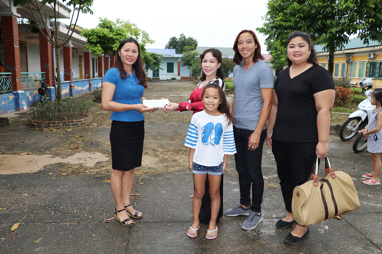 Nhìn thấy cảnh sân trường nhiều chỗ đọng nước, không bằng phẳng và có phần trơn trợt, nghệ sĩ Việt Hương liền chủ động đề nghị được góp số tiền 30 triệu đồng để xây dựng lại.