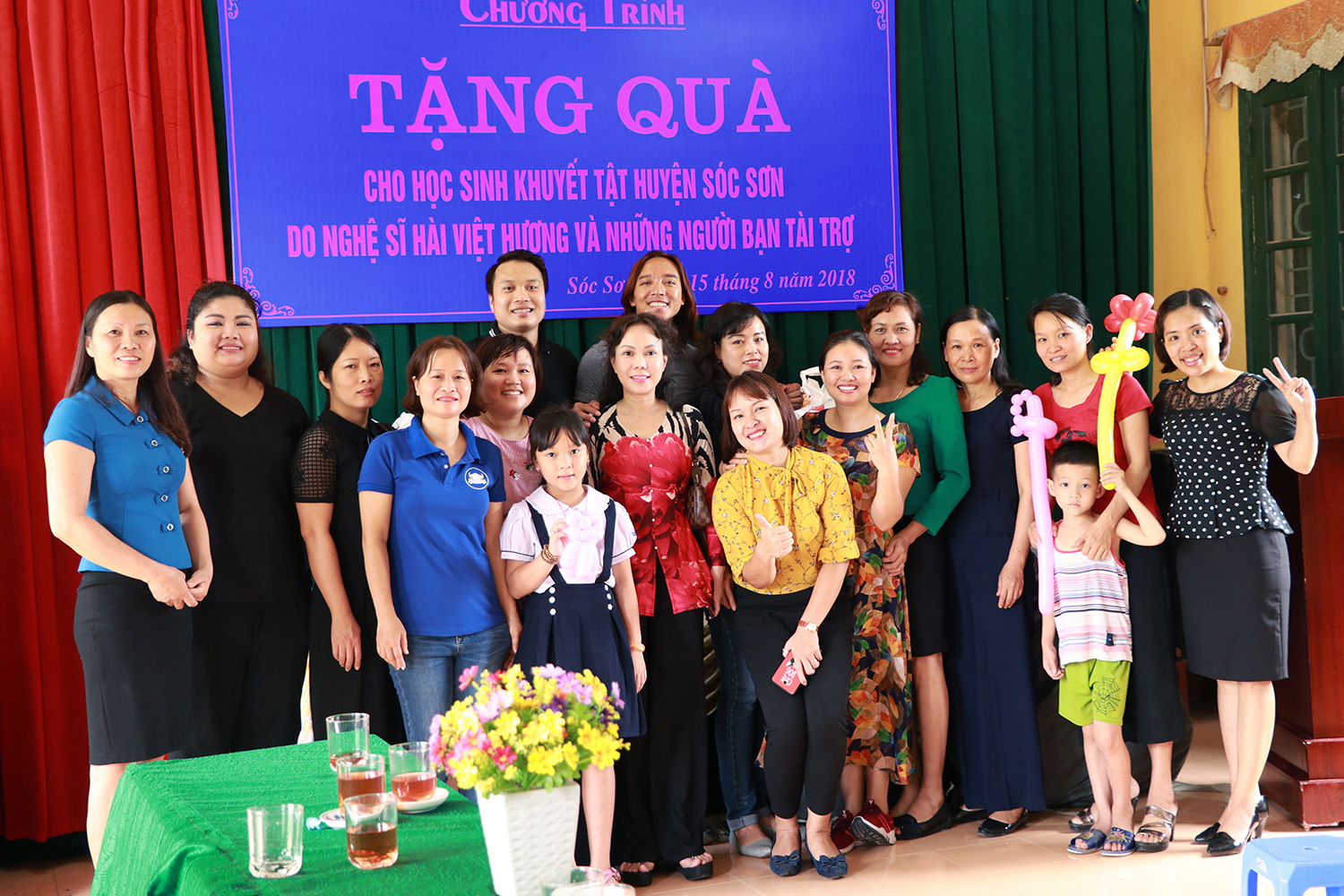 Việt Hương cùng gia đình và bạn bè chụp ảnh kỉ niệm chuyến thiện nguyện.