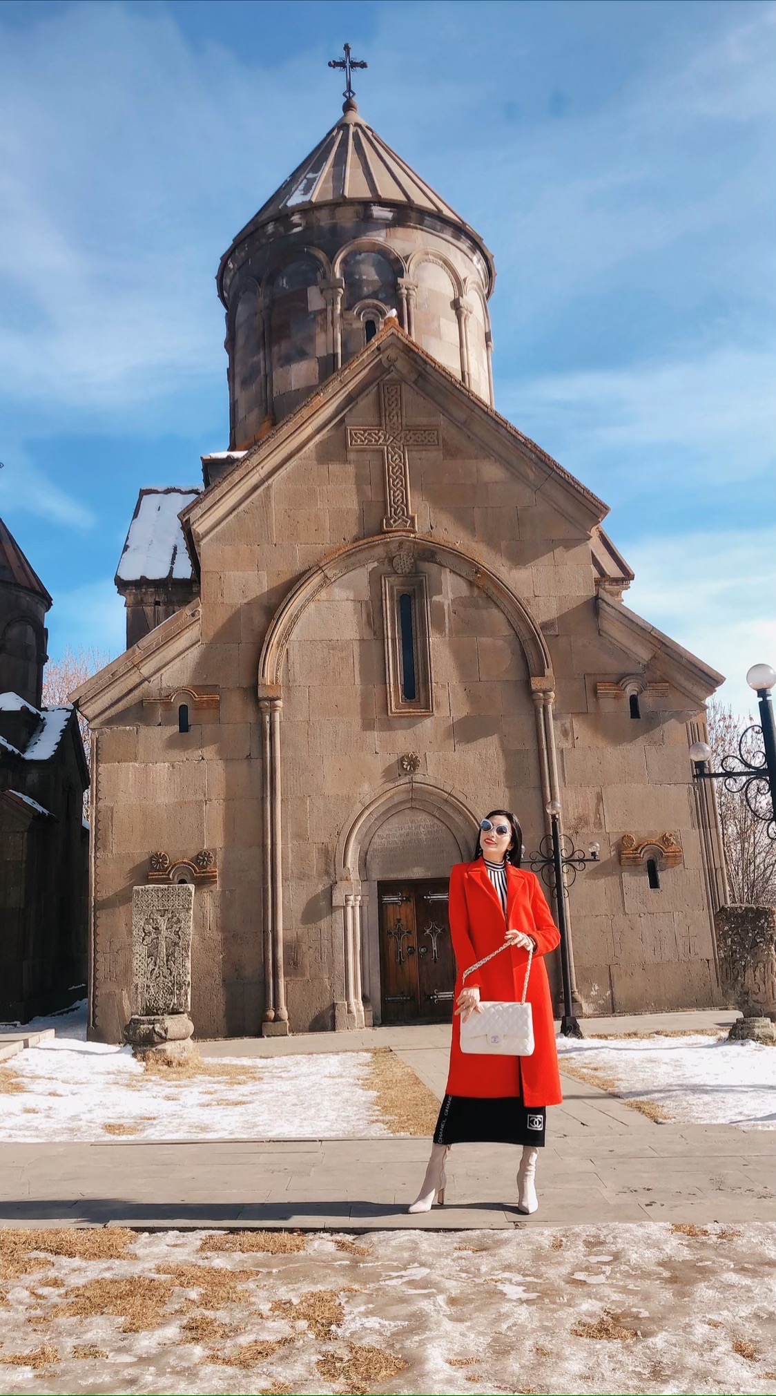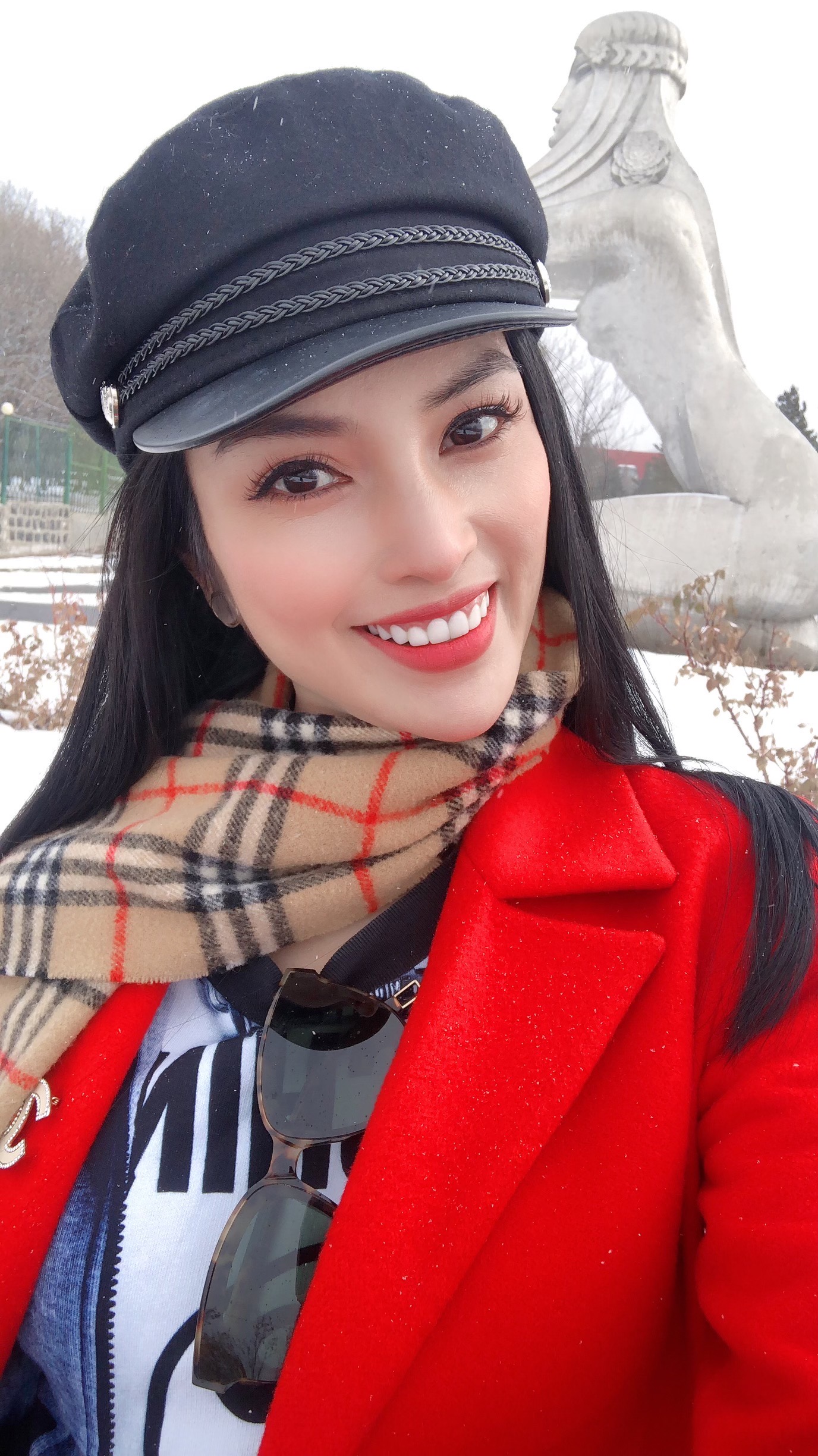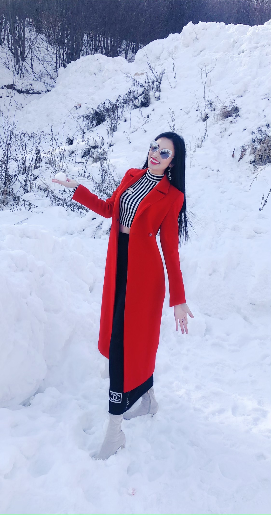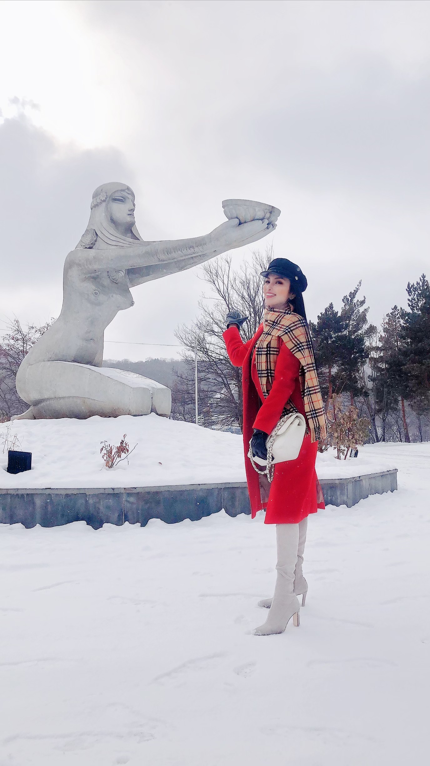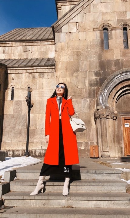 Angel Kim khoác trên mình chiếc áo dạ đỏ giữa khung cảnh trời tuyết trắng xoá, trông cô chẳng khác nào một “nữ hoàng” nổi bật tại đất trời Châu Âu khiến cho bất cứ ai cũng phải ngắm nhìn.
