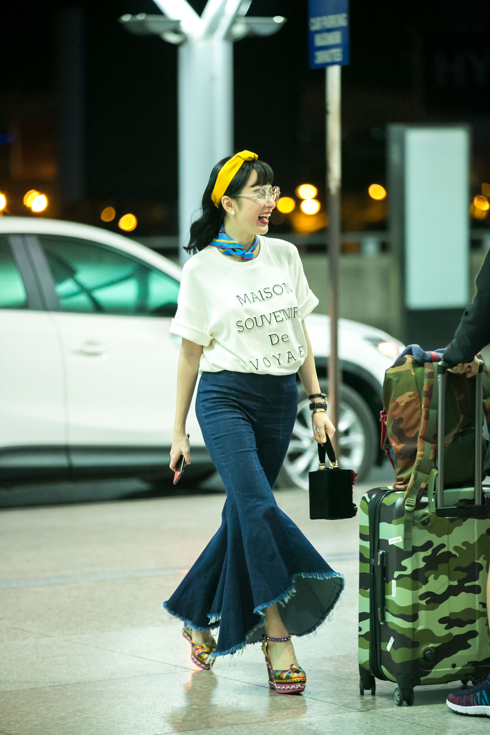 Người đẹp nổi bật ở sân bay khi diện quần jeans ống loe, áo thun rộng khỏe khoắn.