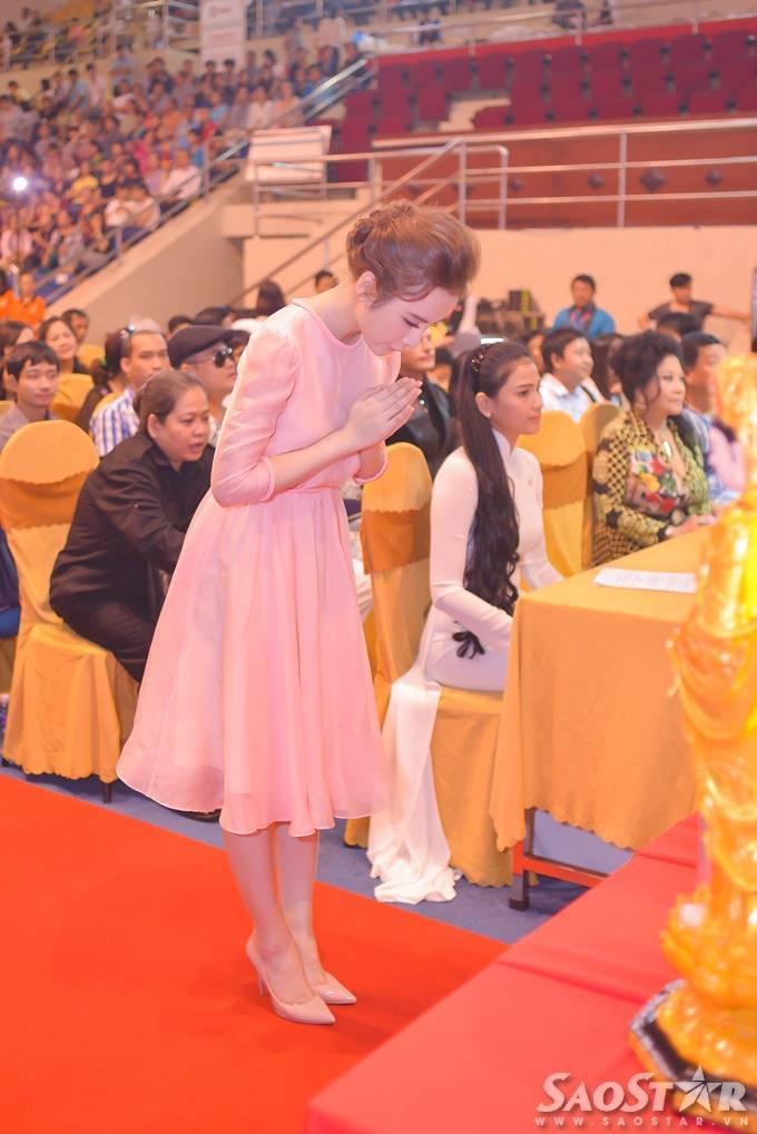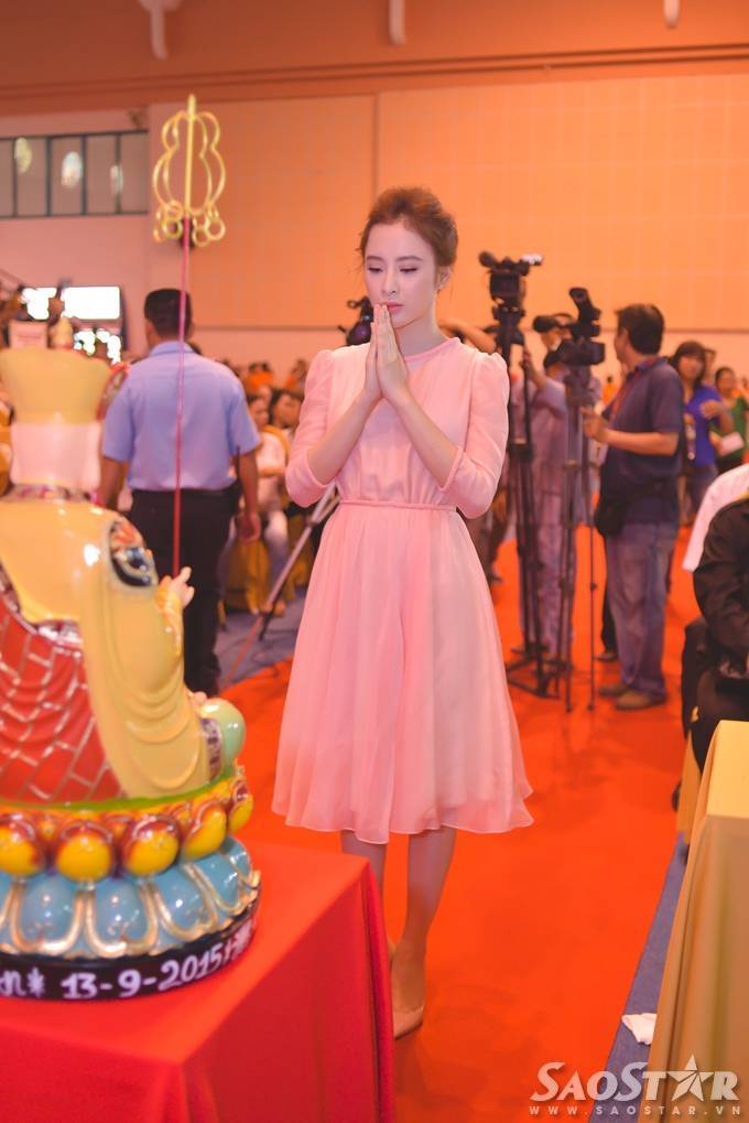 Nữ diễn viên Tiểu thư đi học dành thời gian lạy Phật trước khi sự kiện bắt đầu.