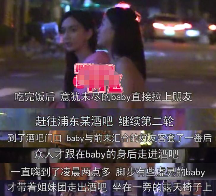 Sau khi dùng bữa, nhóm bạn cùng nhau đến một quán bar ở phố Đông Thượng Hải, ở đến rạng sáng. Dường như Angelababy có uống một chút rượu, dáng đi của cô có vẻ loạng choạng, không vững. Rời khỏi quán bar, Angelababy cũng không về nhà, cô ngồi ghế được đặt ở ngoài trời và tiếp tục tán gẫu với bạn bè.