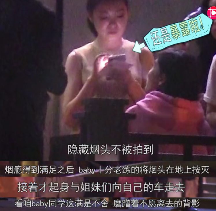 Ngay sau đó, nữ diễn viên liên tục phì phèo trong khói thuốc lá. Phóng viên chụp những hình ảnh này miêu tả động tác của Angelababy khi hút thuốc vô cùng thành thục. Khi gần hút xong một điếu, cô nàng quăng mẫu thuốc xuống đất rồi lấy chân dụi để khói tắt đi. Đến lúc này, cô mới chào tạm biệt những người bạn và ra về.