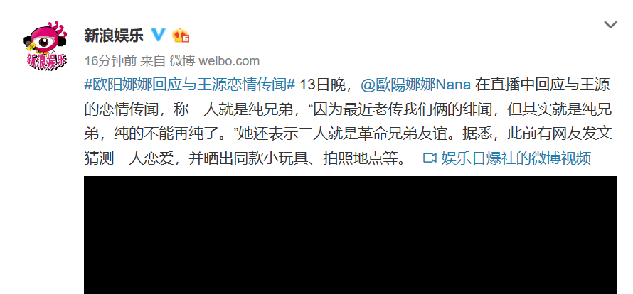 Vào tối ngày 13.08, khi tham gia buổi live stream tương tác với khán giả, lần đầu tiên Âu Dương Na Na trực tiếp phản hồi trước những tin đồn tình yêu giữa mình với Vương Nguyên. Cô trả lời: “Gần đây, luôn có những tin nói rằng giữa tôi và Vương Nguyên có quan hệ yêu đương. Thế nhưng, tôi và cậu ấy chính là tình huynh đệ đơn thuần, đơn thuần đến mức không thể đơn thuần hơn được nữa”.