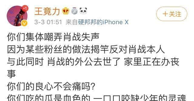 Trước đó, một người bạn của Tiêu Chiến là Vương Cánh Lực tiết lộ chuyện ngôi sao Trần tình lệnh vừa mới trải qua nỗi đau mất người thân. Người này ủng hộ Tiêu Chiến và chỉ trích dân mạng khi dồn ép nam diễn viên vào đường cùng. Việc làm của Vương Cánh Lực chẳng những không xoa dịu được cộng đồng mạng càng khiến Tiêu Chiến trở thành đối tượng bị công kích, cố tình làm trò để PR, lấy cớ để biện hộ.