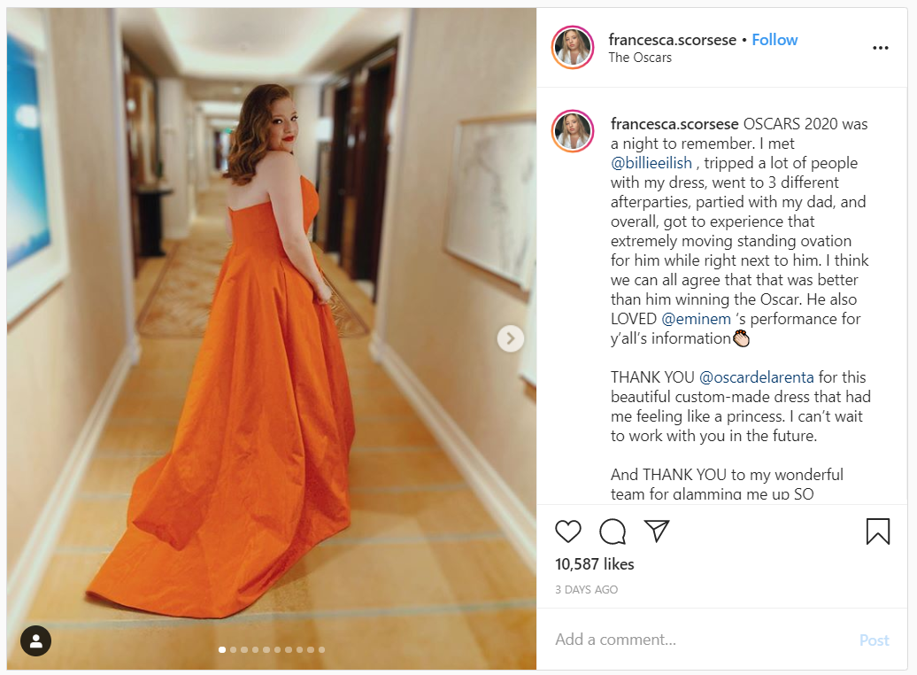 Sau khoảng khắc tương tác huyền thoại của hai đạo diễn lừng danh, con gái Martin Scorsese, Francesca Scorsese, đã đề cập đến màn hoan nghênh nhiệt tình này.