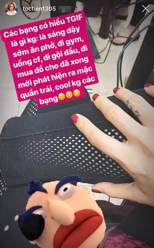 TGIF (Thank God It's Friday) là một thuật ngữ để bày tỏ sự vui mừng khi kết thúc một tuần lễ học tập và làm việc căng thẳng để nghỉ ngơi với 2 ngày cuối tuần. Mới đây, Tóc Tiên khiến cư dân mạng “chết cười” khi định nghĩa về TGIF riêng của cô nàng: “Sáng dậy sớm ăn phở, đi gym, uống cafe, đi gội đầu, đi mua đồ cho đã xong mới phát hiện ra mặc quần trái“. Ngày thứ 6 thư giãn của giọng hát Em không là duy nhất cũng không tránh khỏi “sóng gió” nhưng cô nàng vẫn rất thoải mái chia sẻ, còn dí dỏm hỏi “cool không các bạn?“.