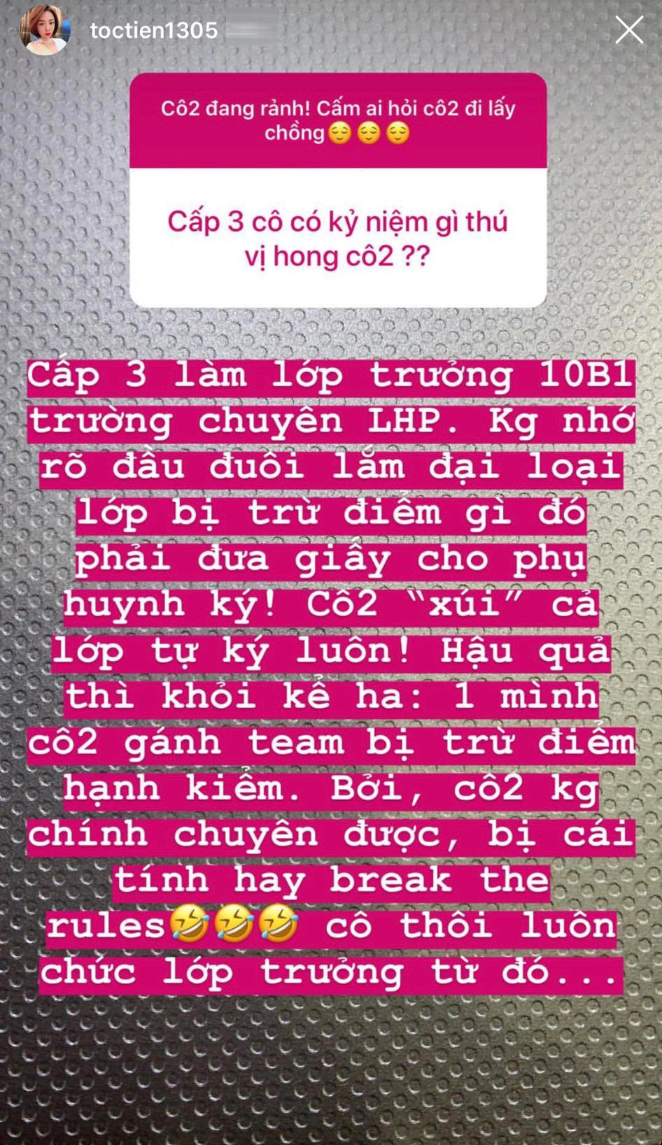 Là một nữ ca sĩ xinh đẹp, quyến rũ với những màn trình diễn đặc sắc trên sân khấu nhưng những ai yêu mến Tóc Tiên đều hiểu rõ cô nàng vốn tính đáng yêu, thậm chí có phần “lầy lội”. Gần đây việc hỏi đáp trực tiếp với fan trên instagram của cô nàng cũng khiến không ít khán giả thích thú vì những câu trả lời đậm chất “bá đạo”.