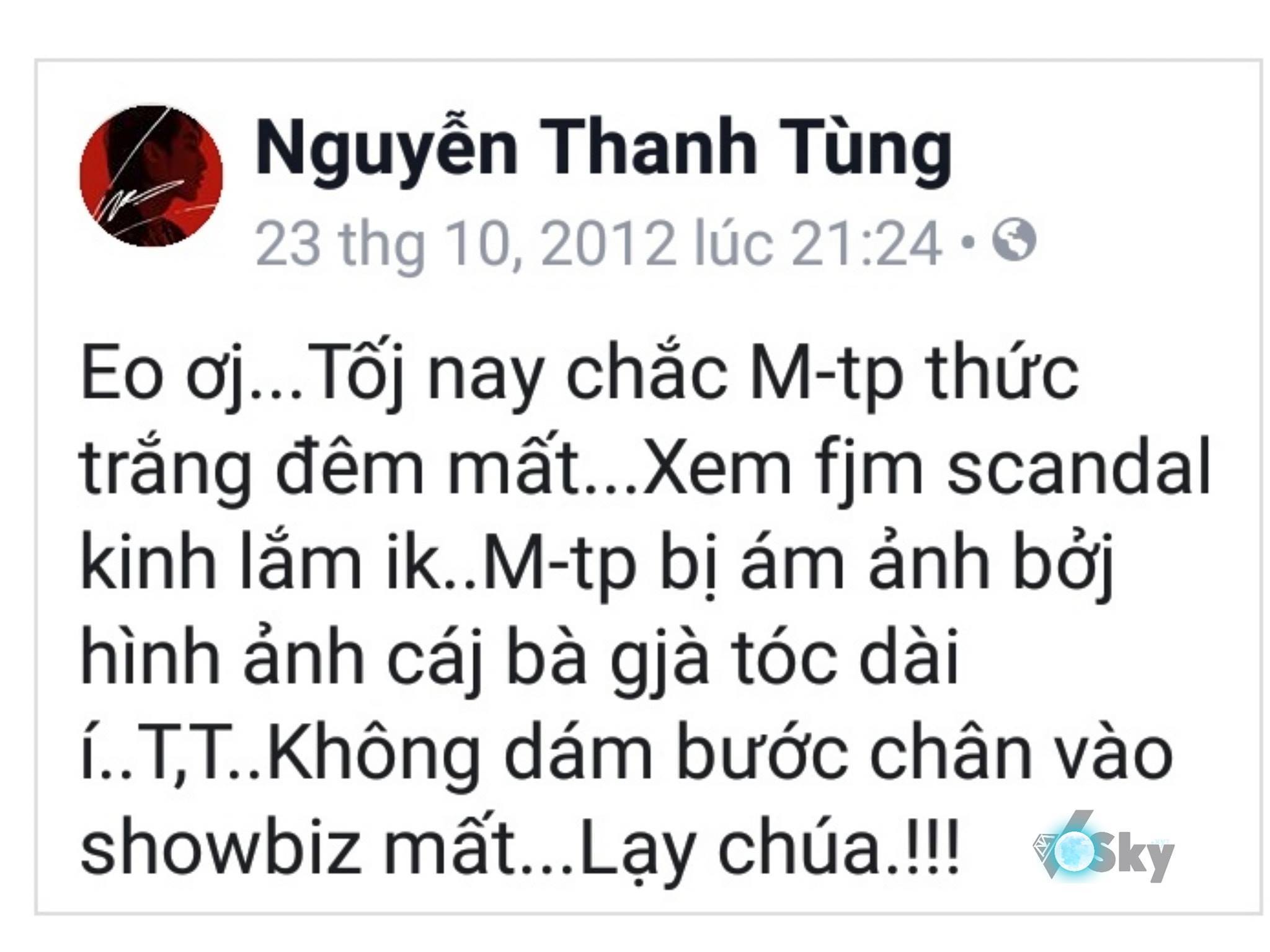 Sơn Tùng M-TP hiện là một trong những nghệ sĩ nổi tiếng nhất nhì showbiz Việt, tuy tuổi đời còn trẻ nhưng anh chàng luôn thể hiện sự trưởng thành và đĩnh đạc trong từng bước đi sự nghiệp của mình. Ấy thế mà mới đây người hâm mộ bất ngờ “đào mộ” lại một dòng trạng thái cũ của nam ca sĩ 7 năm về trước với nội dung đáng yêu “hết nấc”: “Eo ơi. Tối nay chắc M-TP thức trắng đêm mất. Xem phim Scandal kinh lắm í. M-TP bị ám ảnh bởi hình ảnh cái bà già tóc dài í. Không dám bước chân vào showbiz mất“. Hẳn nhiên các Sky được một phen “cười lăn” về độ ngây ngô ngày ấy của anh chàng, thậm chí còn không ngừng trêu chọc: “Dạo này M-TP còn sợ showbiz nữa hông ta?“.