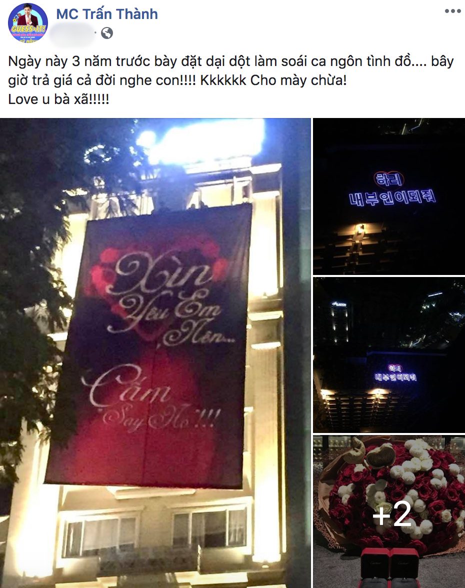 Mới đây, MC Trấn Thành đã đăng tải những hình ảnh của màn cầu hôn anh dành tặng Hari Won 3 năm về trước cùng dòng trạng thái hài hước: “Ngày này 3 năm trước bày đặt dại dột làm soái ca ngôn tình đồ…. bây giờ trả giá cả đời nghe con!!!! Kkkkkk Cho mày chừa! Love u bà xã!!!!!“. Đáp lại, giọng hát Anh cứ đi đi cũng hóm hỉnh không kém: “Hình như ngày ấy… ông ấy….. ĐIÊN rồi“.