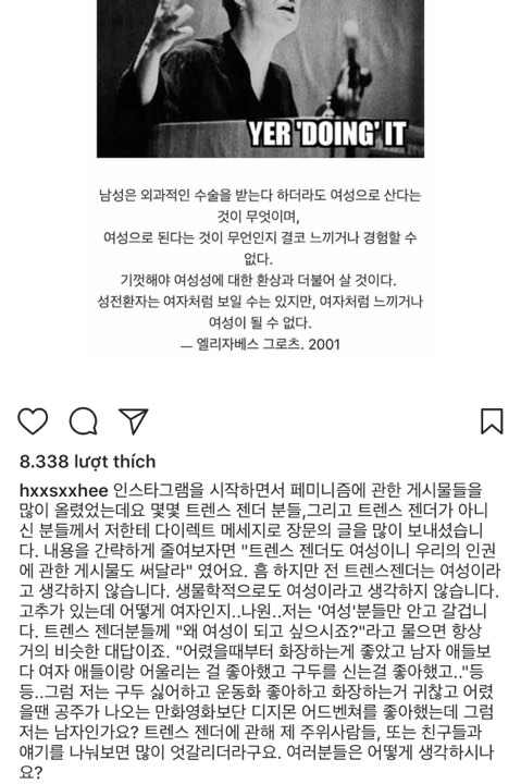 Cụ thể, Han Seo Hee viết: “Khi tôi bắt đầu dùng Instagram, tôi đăng nhiều bài viết nói về nữ quyền. Khi ấy, tôi nhận được nhiều tin nhắn từ những người chuyển giới. Họ nói rằng vì người chuyển giới cũng có cả phụ nữ, nên hãy đăng về quyền của họ nữa.