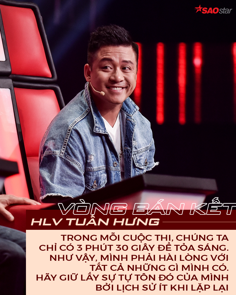 Điển hình là câu nói HLV Tuấn Hưng dành cho Layla sau khi cô nàng cảm thấy “tự ti” về phần trình diễn của mình. HLV Tuấn Hưng chia sẻ: “Mỗi cuộc thi, chúng ta chỉ có một lần xử lý tốt nhất trong vòng ba phút rưỡi. Như vậy, mình phải hài lòng với tất cả những gì mình có. Lịch sử ít khi lặp lại. Em hãy để dành sự tự tôn đó của mình cho những lần kế tiếp”.