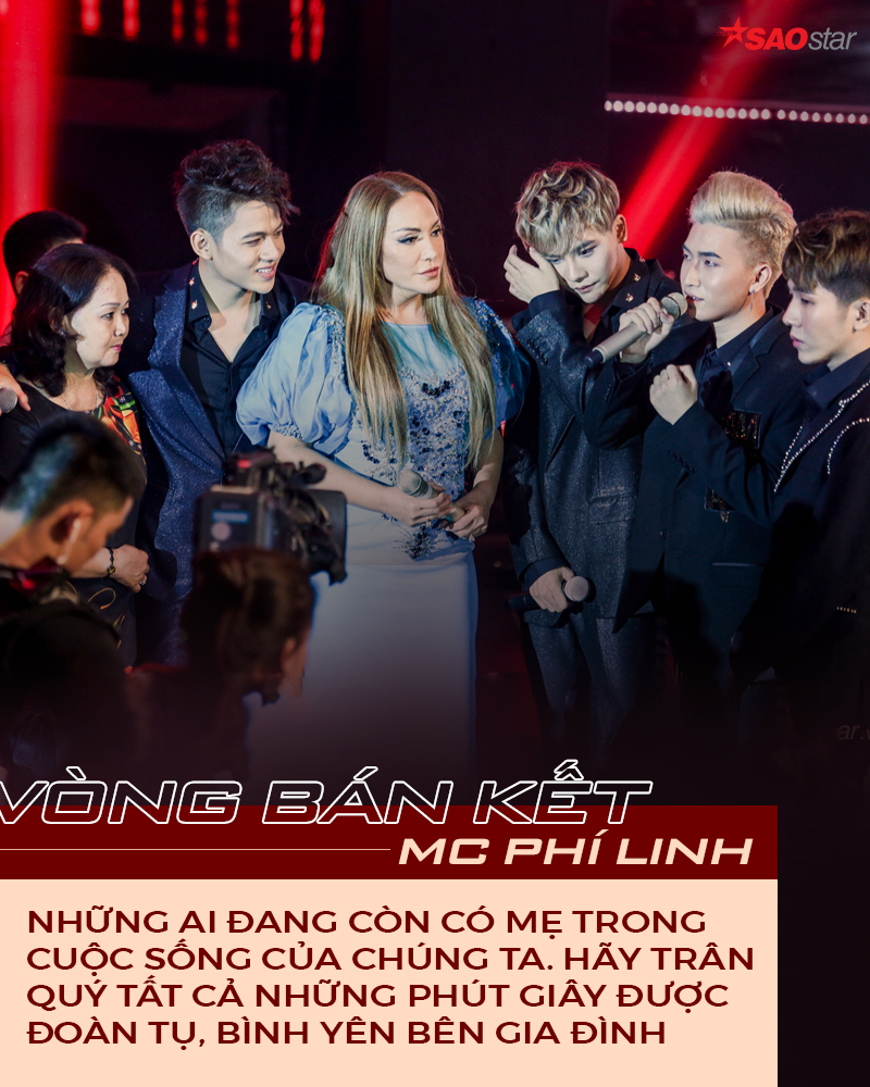 Theo dõi phần trình diễn xúc động của DOMINIX với “chị hai” Thanh Hà, chứng kiến những giọt nước mắt của họ rơi xuống, MC Phí LInh nhắn nhủ rằng: “Những ai đang còn có mẹ trong cuộc sống của chúng ta. Hãy trân quý tất cả những phút giây mà chúng ta đoàn tụ, bình yên bên gia đình của mình”.