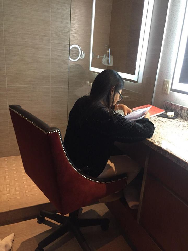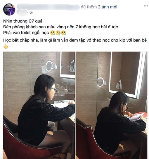 Mới đây, một fanpage bất ngờ chia sẻ bức hình Phương Mỹ Chi ngồi học cặm cụi ở nhà vệ sinh trong thời gian lưu diễn. Theo đó, do đèn phòng khách sạn màu vàng, không đủ ánh sáng nên “chị Bảy” đành mang sách vở vào toilet để học bài.