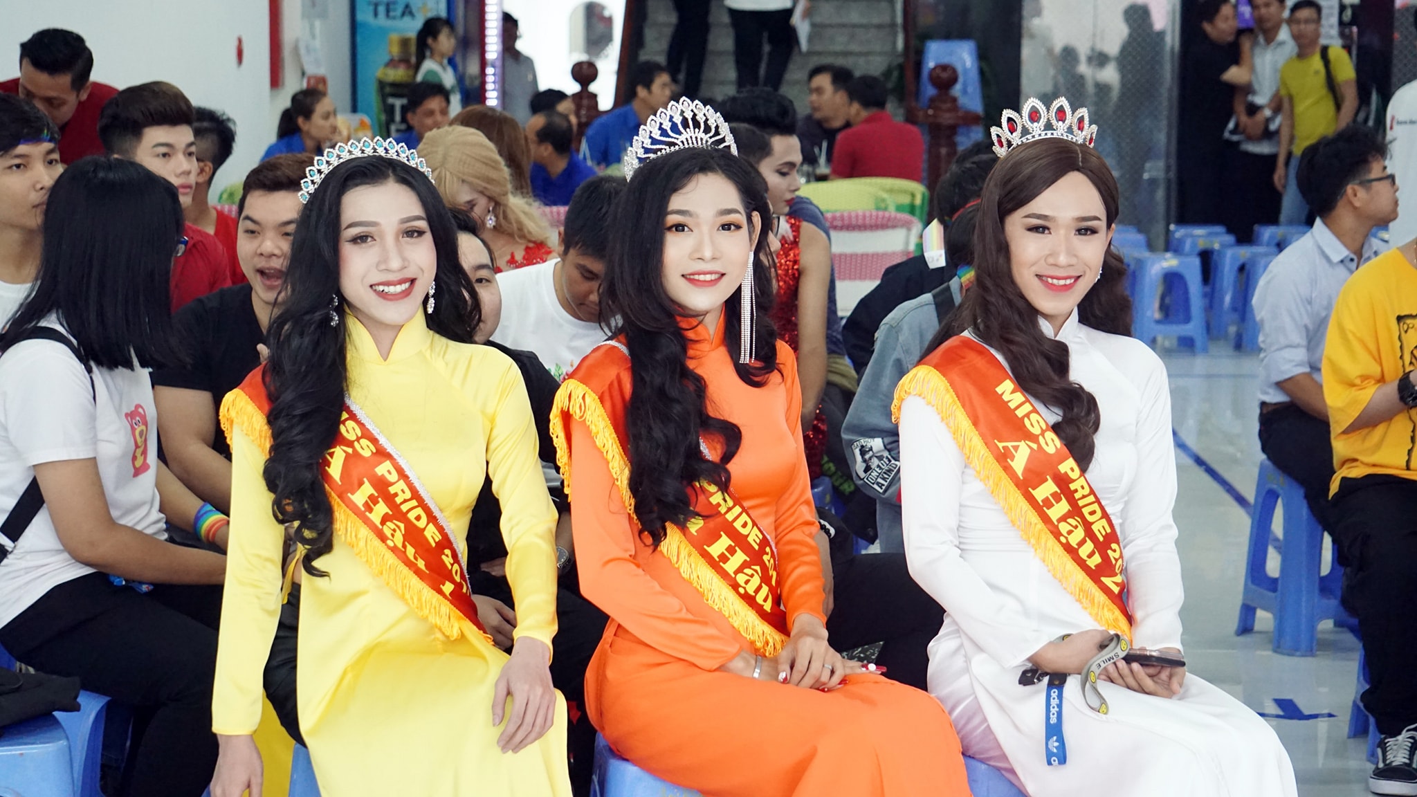 Lê Đoàn Hoàng Linh (ngồi giữa) từng đăng quang cuộc thi Miss Pride 2017 và nhận được rất nhiều sự ủng hộ của cộng đồng LGBT.