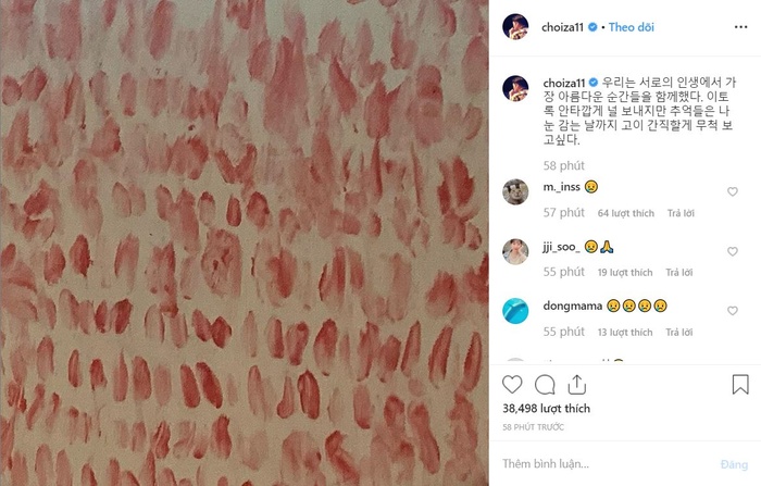Choiza đã bị công chúng chửi bới, nguyền rủa rất nhiều trong những ngày Sulli “nhắm mắt xuôi tay”. Trước tình hình trên, nam ngôi sao đã phát hành một bài viết thông qua mạng xã hội Instagram với nội dung: “Chúng ta đã có với nhau những kỷ niệm đẹp nhất trong cuộc đời. Thật đáng tiếc vì anh đã để em ra đi như vậy nhưng những ký ức đẹp đẽ đó anh sẽ giữ mãi trong lòng cho đến ngày anh nhắm mắt xuôi tay. Anh nhớ em rất nhiều”.