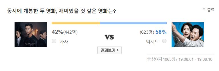 “Hai bộ phim công chiếu cùng 1 lúc, bạn thấy cái nào thú vị hơn?”. 42% người chọn “The Divine Fury” của Park Seo Joon và 58% chọn “Lối thoái trên không” của Yoona và Jo Jung Suk.