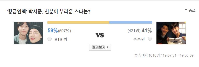 “'Mạng lưới hoàng kim' Park Seo Joon, bạn ghen tỵ với ngôi sao nào?”. Có 597 người chọn V (BTS) và 421 người chọn cầu thủ bóng đá Son Heung Min.