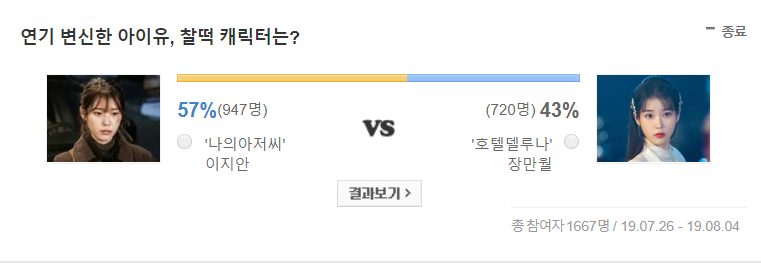 “Chuyển đổi diễn xuất của IU, nhân vật nào phù hợp hơn?”. 57% phiếu bầu dành cho vai Lee Ji Ah trong “My Ahjussi” và 43 % chọn vai Jang Man Wool của “Hotel Del Luna”.