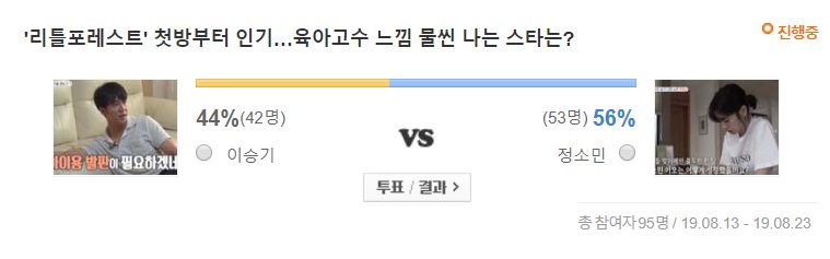 “Chương trình 'Khu rừng nhỏ' nổi tiếng ngay từ tập đầu tiên. Bạn cảm thấy ai là một phụ huynh thích nuôi dạy con cái?”. Có 58% người chọn Jung So Min và 44% người chọn Lee Seung Gi.