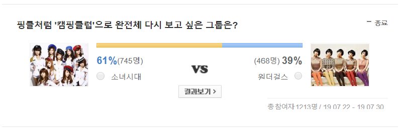Câu hỏi: “Giống như Fin.K.L, bạn muốn nhóm nhạc nữa nào tham gia chương trình 'CampingClub”?. Kết quả cuối cùng, 61% người chọn SNSD và 39% chọn Wonder Girls.