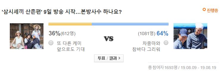 “Ngày ba bữa” bản nữ phát sóng tháng 9….bạn xem thường xuyên chứ?”. Kết quả, có 64% chọn “Nhớ Cha Seung Won và Yoo Hae Jin”. Và có 36% chọn: “Mong chờ phản ứng hóa học khác”.