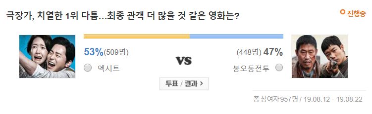 “Màn ảnh rộng, trận chiếu vị trí 1…bộ phim nào có nhiều khả năng?”. Kết quả, phim “Lối thoát trên không” mang về 53%, dẫn trước “The Battle: Roar to Victory” của Yoo Hae Jin và Ryu Jun Yeol.