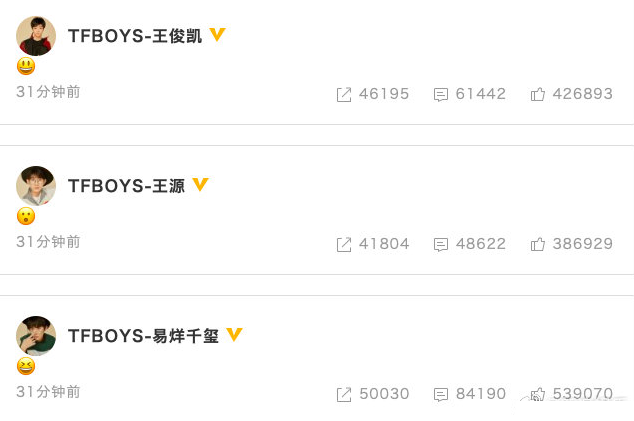 Với việc cập nhật weibo cùng lúc, số liệu weibo của họ khác nhau thế nào cũng đã được hiện thị rõ. Từ trong hình có thể thấy, số lượng like của Vương Tuấn Khải trong vòng nửa tiếng là 420 ngàn, Dịch Dương Thiên Tỉ là 530 ngàn và Vương Nguyên ít nhất với 380 ngàn. Từ những con số này cũng đã phản ánh nhân khí của từng thành viên ra sao, thật làm người khác cảm thấy bất ngờ.