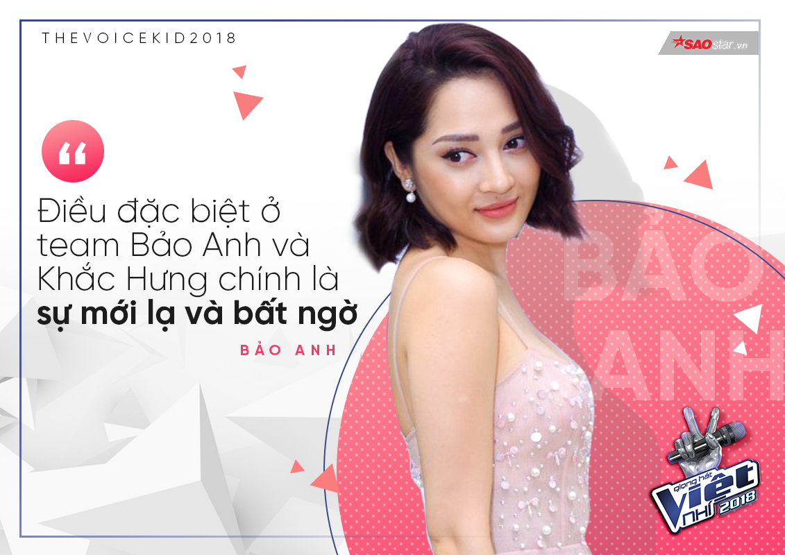 - Khán giả thường thấy một Bảo Anh đa năng cả về hình ảnh lẫn âm nhạc nhưng tại The Voice Kids 2018, phần “giằng co” các tài năng nhí vẫn đang là ẩn số. Bảo Anh có thể bật mí đôi chút “chiến thuật” của bản thân trước khi chương trình lên sóng?