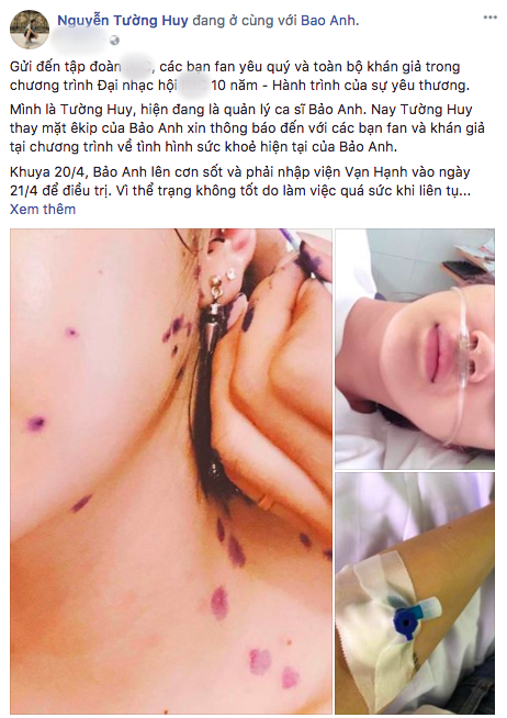 Mới đây, những hình ảnh Bảo Anh nhập viện vì làm việc kiệt sức được quản lý của nữ ca sĩ đăng tải trên trang Facebook cá nhân khiến khán giả và người hâm mộ lo lắng. Theo đó, giọng ca Anh muốn em sống sao phải huỷ hàng loạt show diễn để điều trị bệnh.