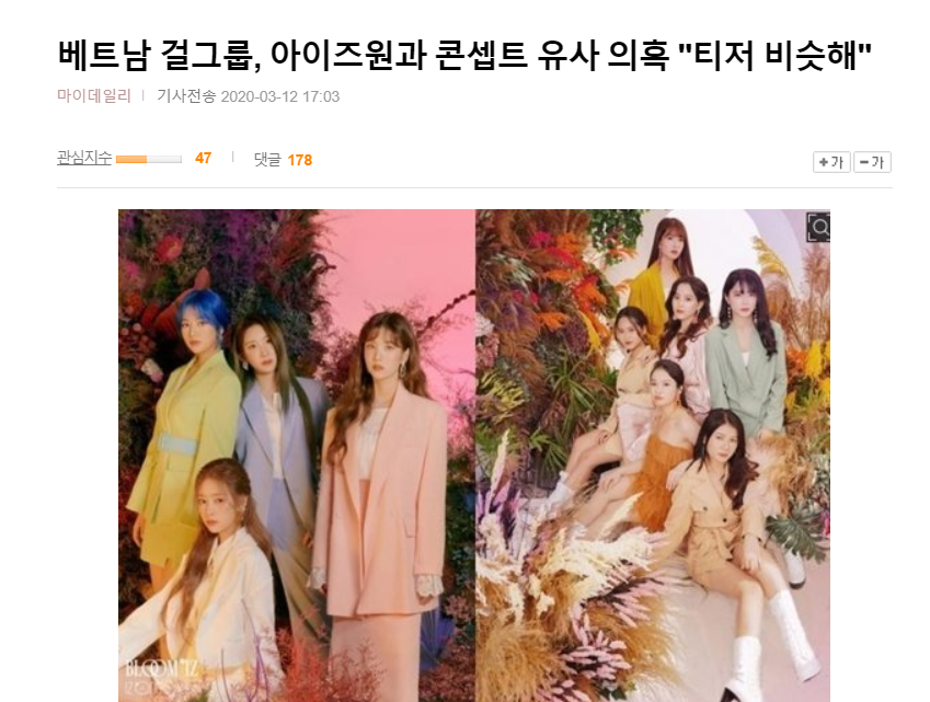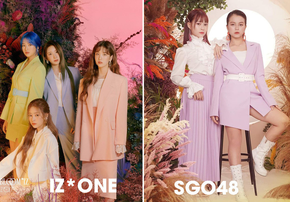 IZ*ONE tạo dáng trong trang phục màu pastel với những bông hoa đầy màu sắc ở hậu cảnh. SGO48 cũng thu hút sự chú ý bởi những bức ảnh và phong cách tương tự. Việc cắm hoa được sử dụng làm nền cũng có nhiều điểm tương đồng.