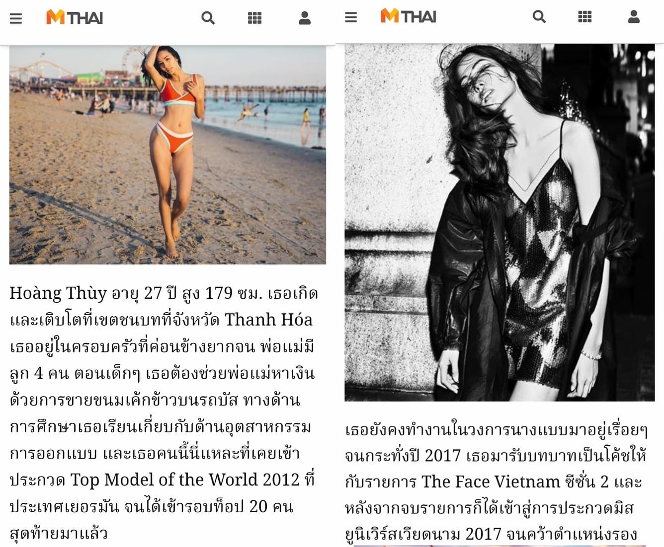 Mới đây, một trang thông tin điện tử dành cho nữ giới Thái Lan bất ngờ đăng tải bài viết về Á hậu Hoàn vũ Việt Nam 2017 - Hoàng Thùy. Cùng với loạt hình ảnh ấn tượng của chân dài sinh năm 1992, trang MThai đánh giá cao kinh nghiệm làm người mẫu và tiềm năng tỏa sáng của Hoàng Thùy tại đấu trường nhan sắc nóng bỏng nhất hành tinh - Miss Universe.