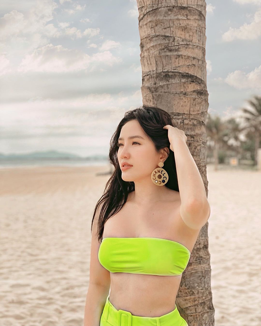 Diện bộ bikini màu neon, Bảo Thy đang đốt mắt nhiều người. Vóc dáng của cô nàng nóng bỏng, gợi cảm không hề kém cạnh những mỹ nhân khác trong showbiz Việt. Bảo Thy chia sẻ: “Ai thích gầy chứ riêng Thy thấy phụ nữ đầy đặn dễ cưng hơn. Diện bikini để khoe dáng tròn xinh nè”.
