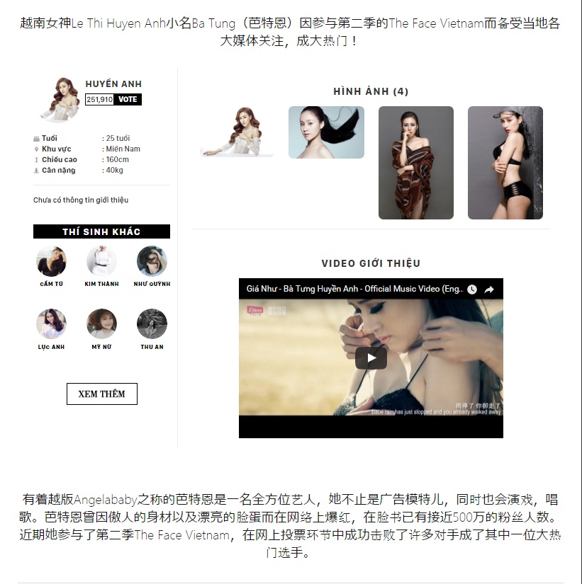 Trang báo Trung Quốc ví Huyền Anh (Bà Tưng) như Angelababy của Việt Nam. Trang này ưu ái dành nhiều mỹ từ để nói về Huyền Anh như sở hữu hình thể nóng bỏng và khuôn mặt ấn tượng cùng khả năng diễn xuất.