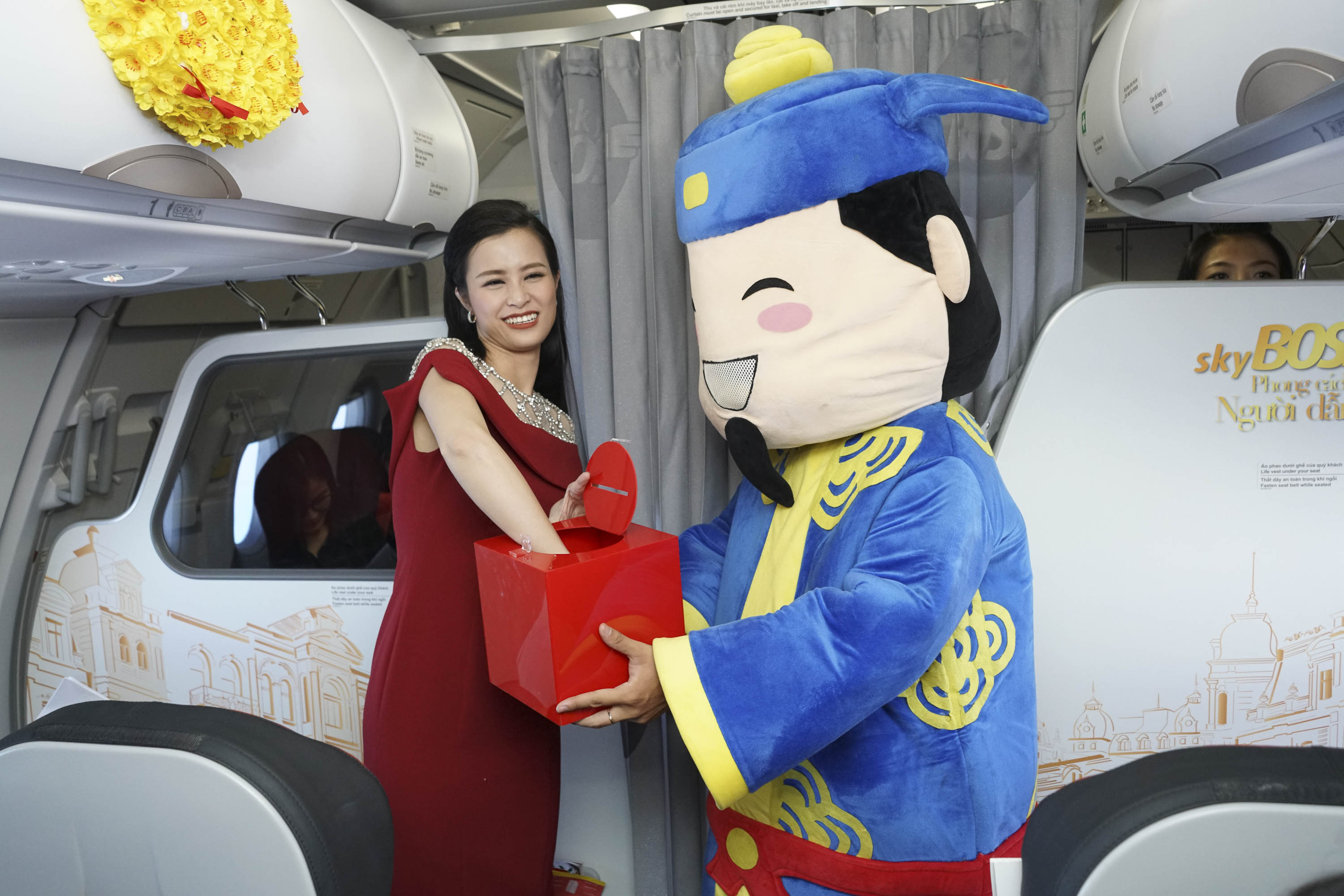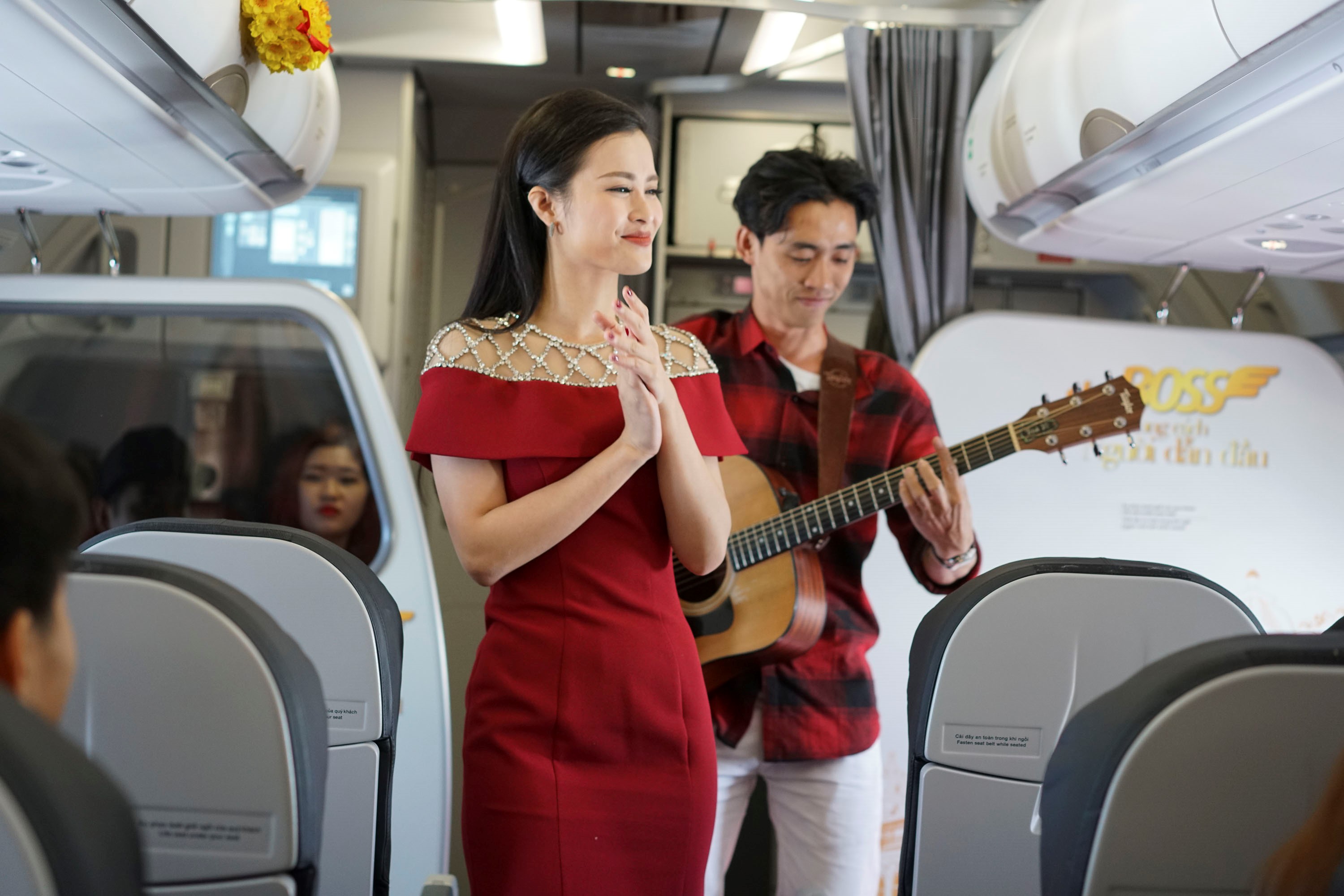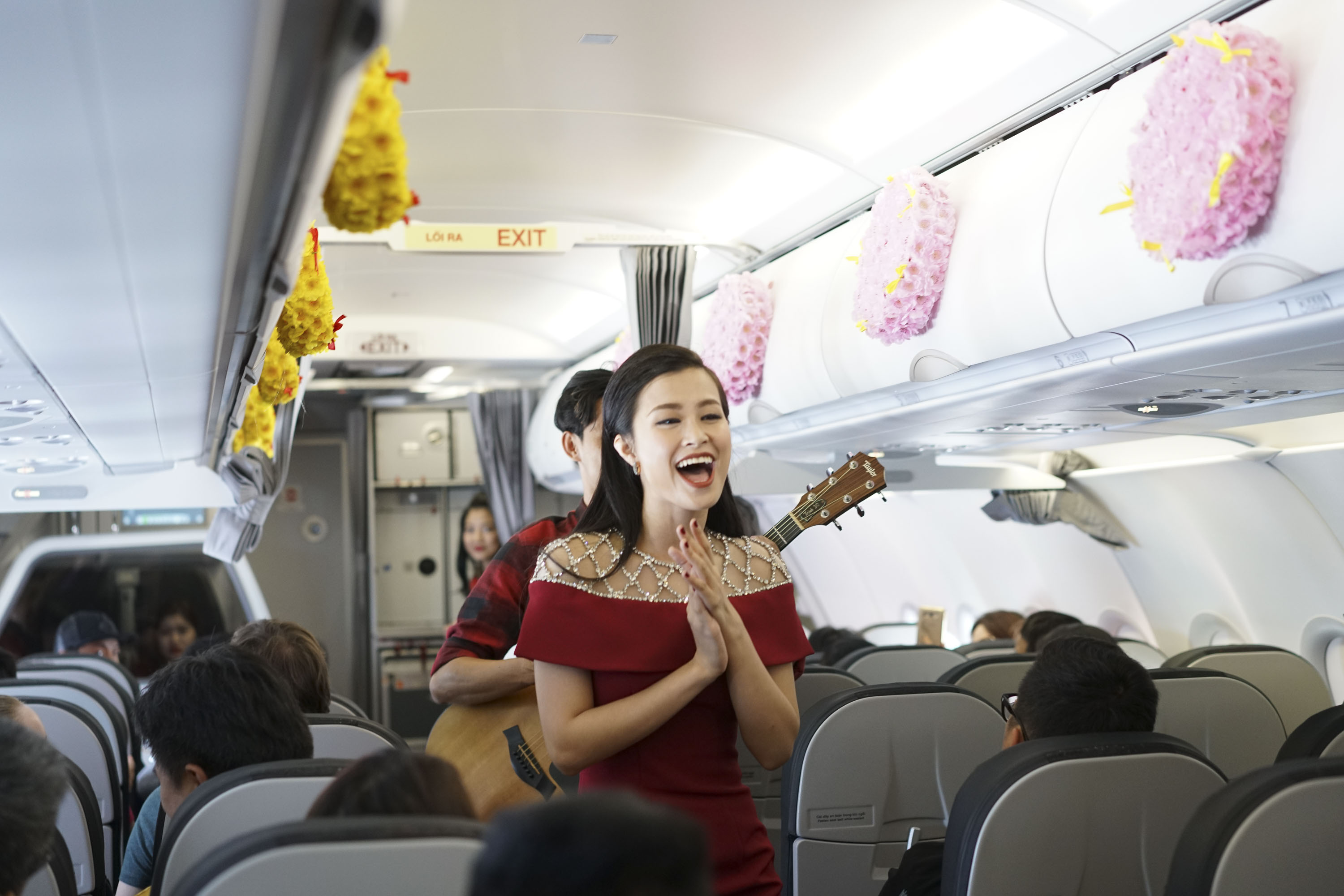 Dù chỉ vài phút biểu diễn nhưng nữ ca sĩ đã tạo nên không khí sôi động và cảm giác thích thú cho mọi người khi liên tục nhún nhảy với những vũ điệu vô cùng đáng yêu. Thậm chí cô còn bước xuống từng hàng ghế để giao lưu cùng khán giả. Phần trình diễn của người yêu Ông Cao Thắng nhận được nhiều tràng pháo tay, tạo nên một chuyến bay thật đặc biệt với không khí sôi động, ấm áp vào thời điểm đầu năm.