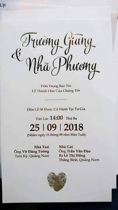 Cách đây ít giờ, trên mạng xã hội bất ngờ chia sẻ thiệp cưới của Nhã Phương và Trường Giang. Trên thiệp cưới ghi rõ tên tuổi thân sinh hai bên gia đình. Theo đó, thời điểm đám cưới diễn ra là và lúc 14h ngày 25/9 tại quê hương Quảng Nam của chú rể. Đám cưới của Trường Giang và Nhã Phương có thể nói là sự kiện được công chúng đón chờ nhất tháng 9 này. Nguyên nhân là bởi cặp đôi này giữ bí mật tuyệt đối mọi thông tin về hôn lễ và gần như hạn chế giới truyền thông đưa tin.