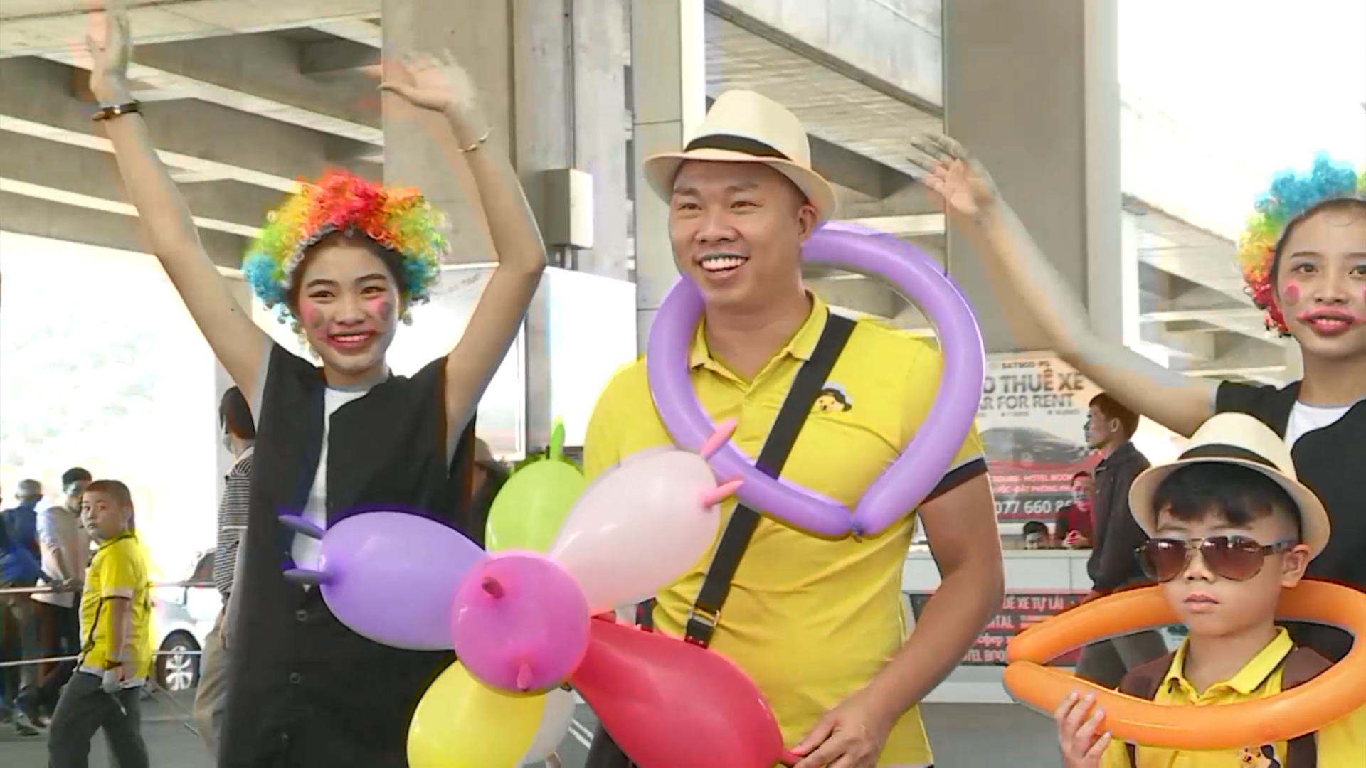 Tại một góc khác của sân bay, người ta bắt gặp một nhóm những “cô hề” ngộ nghĩnh với mái tóc cầu vồng và chiếc mũi đỏ đặc trưng. Thì ra, những hoạt náo viên này xuất hiện chính là để chào đón hai bố con nhà Híp.